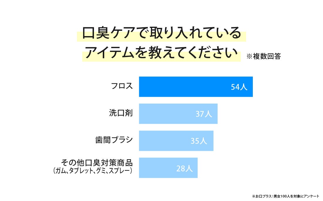 男女100人に口臭ケアで取り入れているアイテムを聞いてみたところ、「フロス」が最多でした。