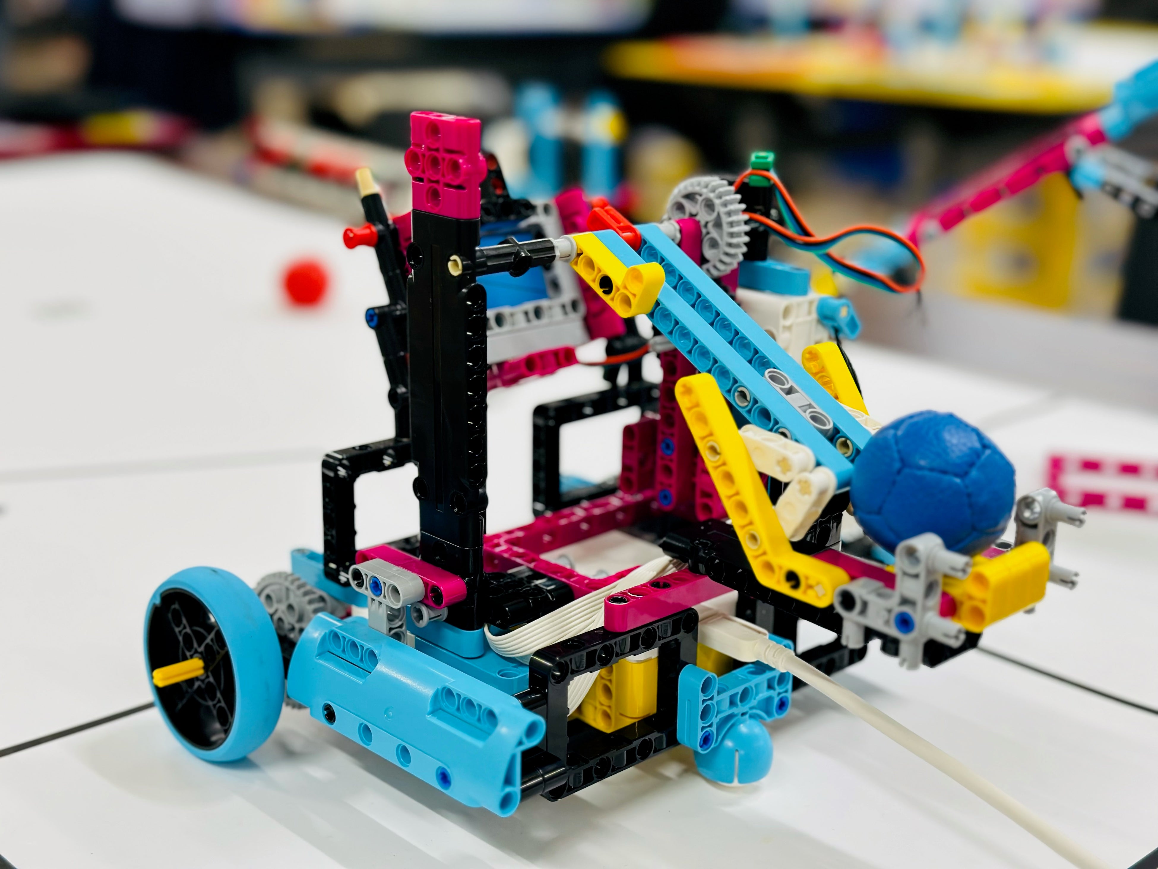 小学2年生から高校3年生までが、学ぶことが可能なスクールで、ロボットキットやボールに加え、ワークブックやモデルの組み立てに必要となるビルディングブックを用意することで、年間48コマの学びができる構成となっております。最初は10分の1サイズから始まり、最終的にはカメラを搭載させることで、コート上の球を画像解析で読み取り、自動的に投球することまで行います。また、ロボッチャ®だけではなく、構造や力学、テコなどの「原理学習」を、実際にモデルをつくって動かすことにより、世の中でどのように活用されているかの繋がりを知り、ロボッチャ®で学んだエンジニアリングの知識やプログラミングのスキルをつかって、社会問題の解決まで考え、学ぶことを行います。