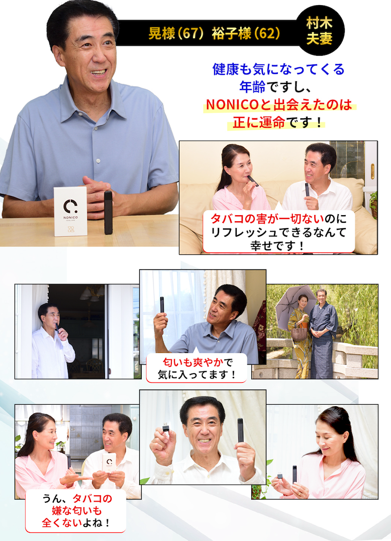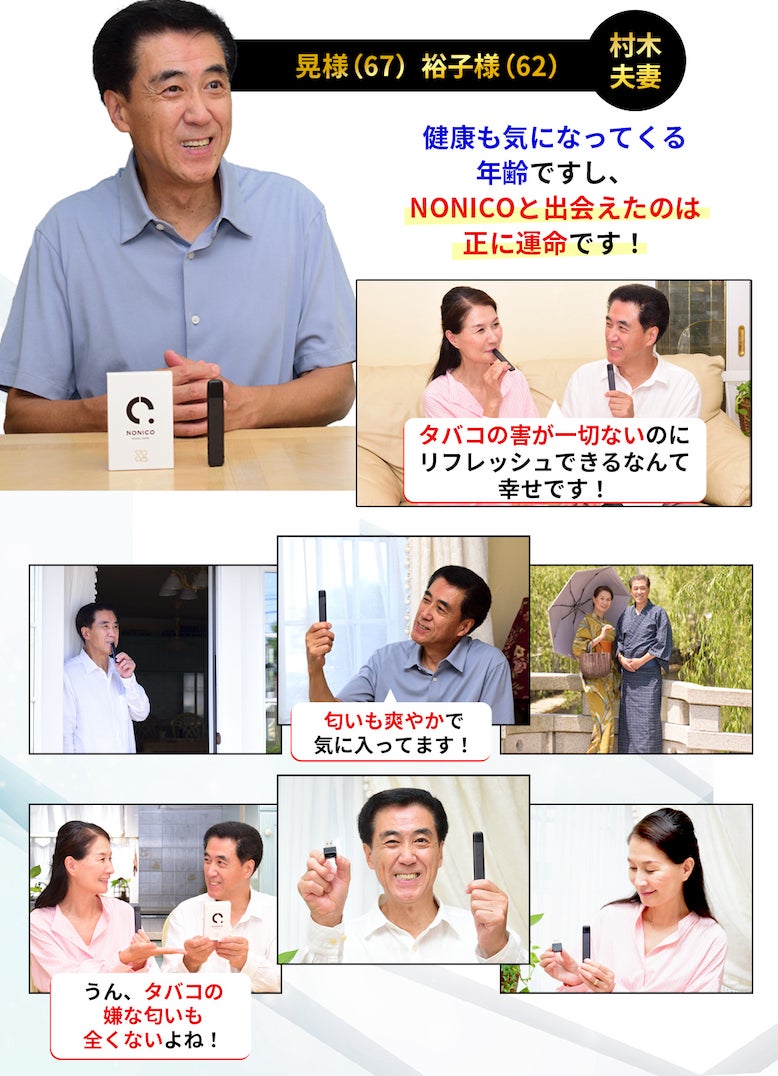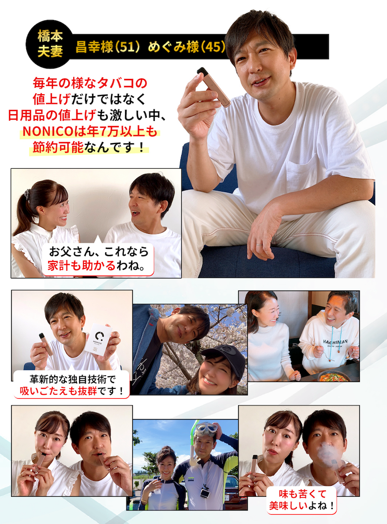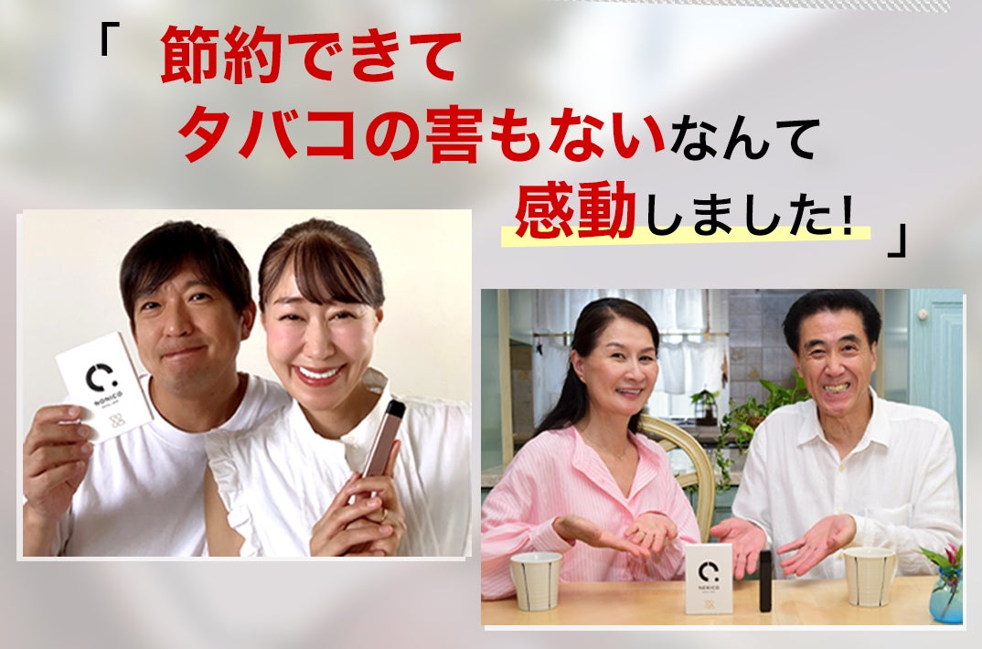 株式会社Nonico(本社:東京都港区)が販売を⼿掛ける、ニコチンゼロ・タールゼロの電⼦タバコ「NONICO(ノニコ)」について、橋本夫妻&村木夫妻、現役サッカー選手溝渕雄志さんより素敵なお声を頂戴し広告展開を開始いたしました。
