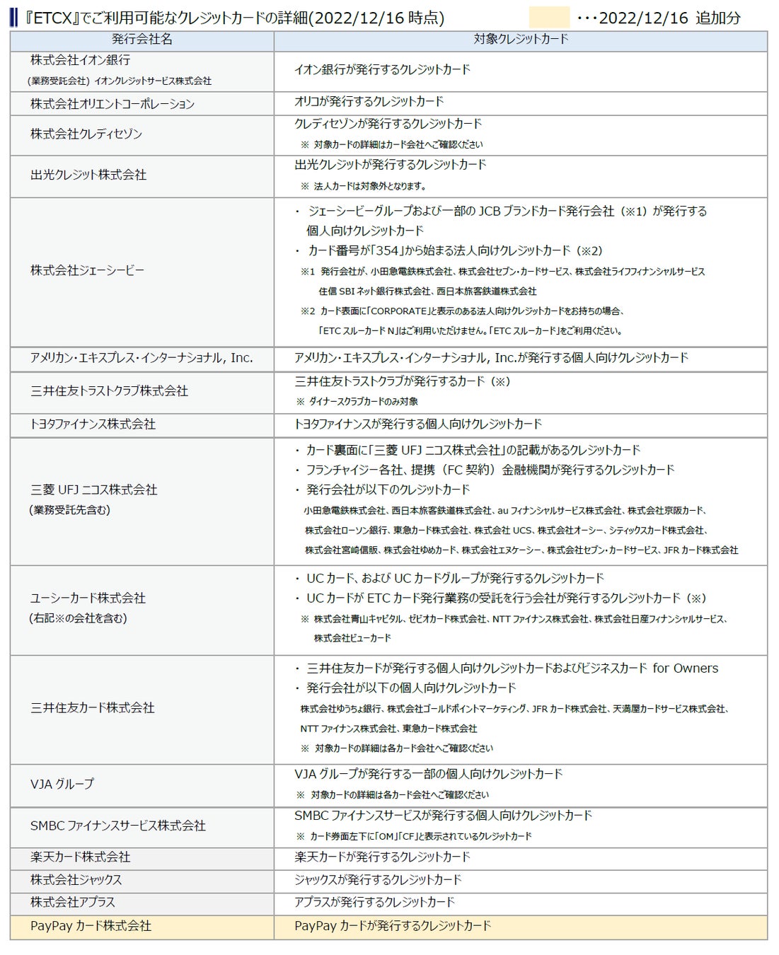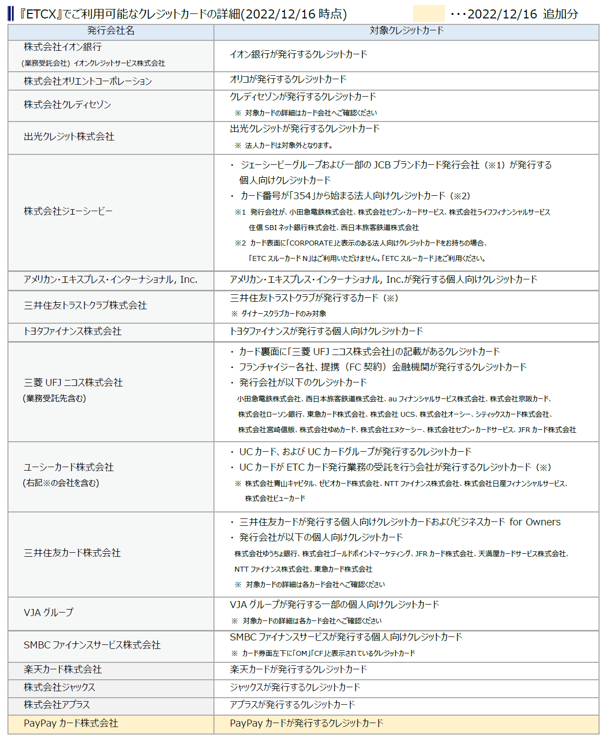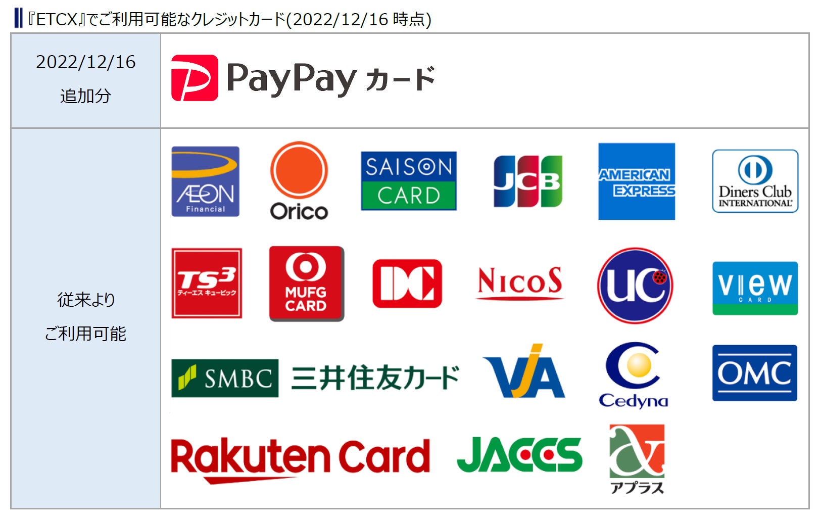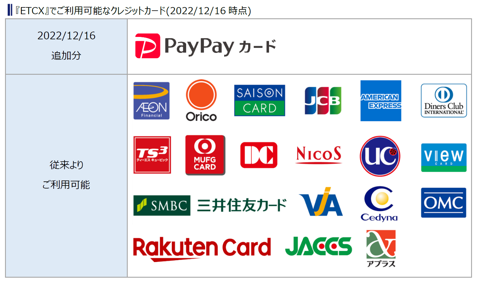 ご利用可能なクレジットカードの詳細につきましては、『ETCX』サービスサイト内「ご利用可能カード一覧」をご確認ください。