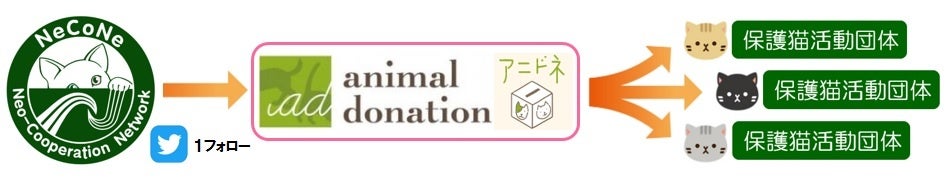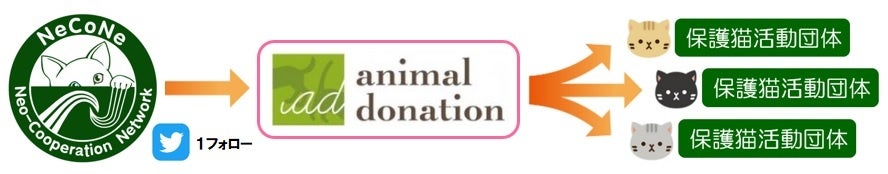 【内容】キャンペーン終了時点の当社公式Twitterアカウントのフォロワー総数×10円 を「日本の動物福祉を世界トップレベルに」をミッションに掲げ、動物専門寄付サイトを運営し、動物福祉向上のための活動を展開している公益社団法人アニマル・ドネーション様に寄付いたします。さらに公益社団法人アニマル・ドネーション様から同法人認定の保護猫活動団体様に寄付が届けられる仕組みです。