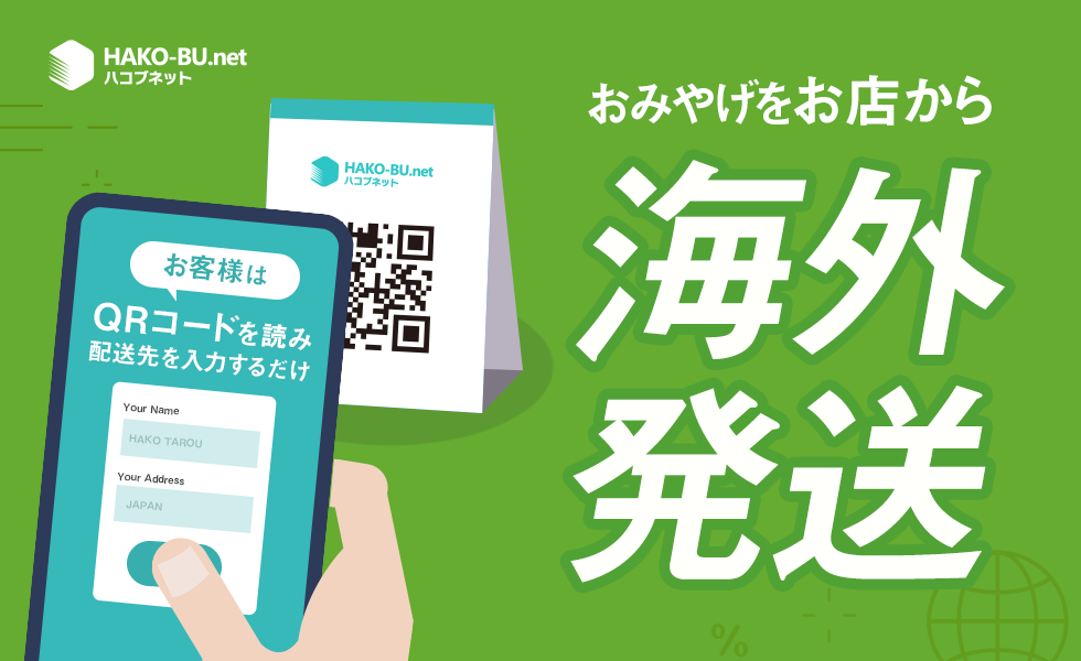ハコブネットのサービスの1つである「海外発送伝票作成サービス」は、店頭から海外へお土産を発送する際に、手書き伝票を使わず発送処理ができるシステムです。