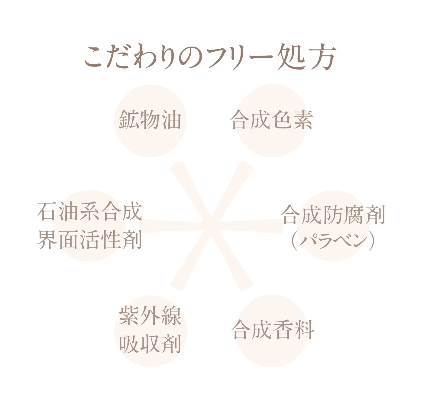 *1 エタノール(感触改良剤)、(アスペルギルス/サッカロミセス)/コメ発酵エキス液(保湿剤) *2 ナタネ油(エモリエント剤) *3 ヒマワリ種子油(エモリエント剤) *4 ヒエヌカ油(エモリエント剤) *5 ハトムギ種子エキス(保湿剤) *6 クロモジ葉/小枝油(着香剤) *7 ソメイヨシノ葉エキス(保湿剤)