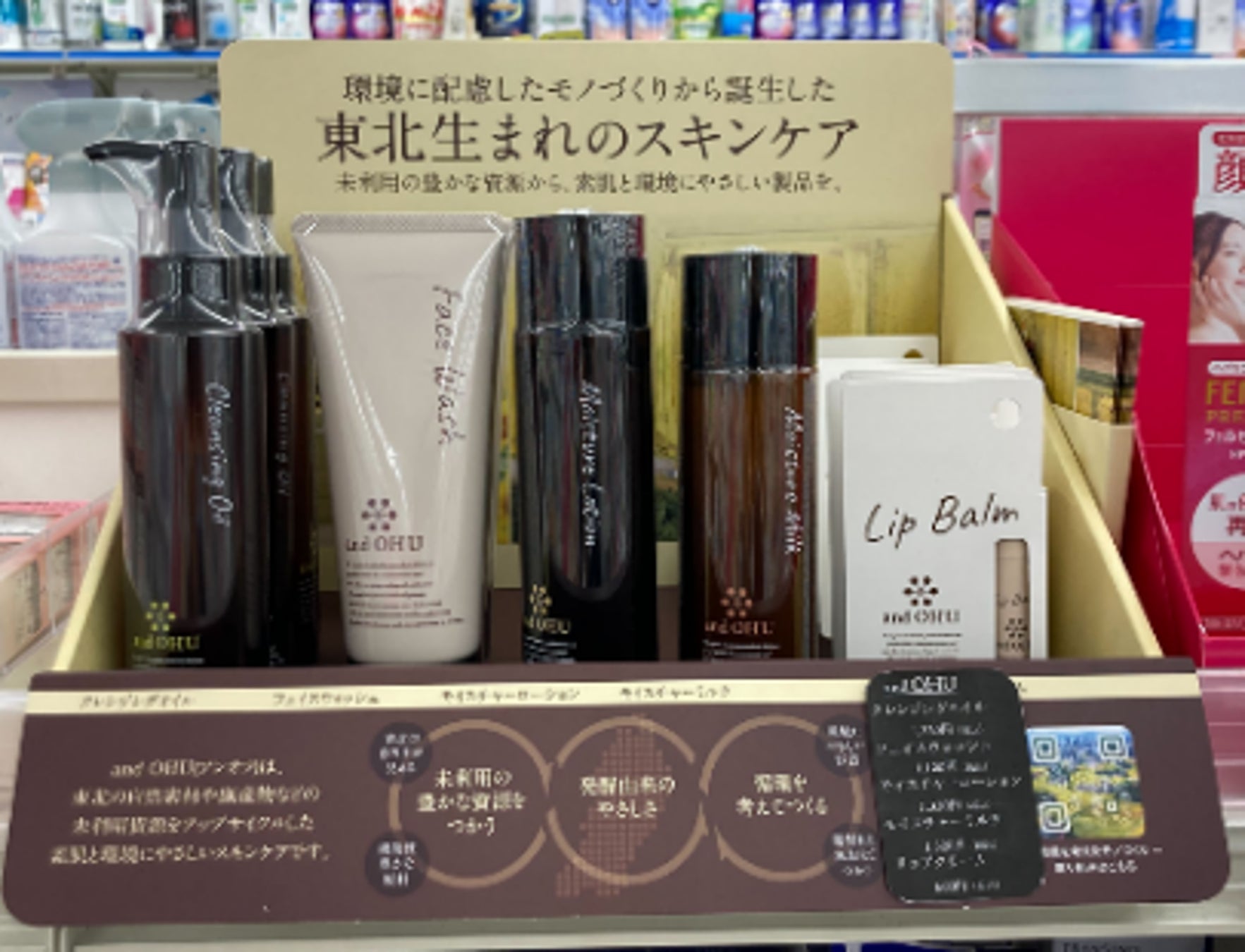 薬王堂で販売開始する「and OHU(アンオフ)」はMedicaとファーメンステーションが共同開発した、東北の自然素材や副産物などの未利用資源をアップサイクル*2した素肌と環境にやさしいスキンケアです。東北の作り手が見える素材を使い、発酵由来のやさしさで機能性豊かな原料を抽出。生産工程で出る発酵粕も無駄なく使う取り組みなど、環境に配慮したモノづくりのスキンケアシリーズです。