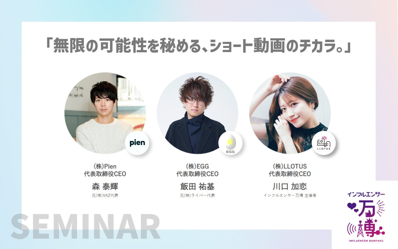 セミナーステージでは『無限の可能性を秘める、ショート動画のチカラ。』をテーマに「森泰輝(株式会社Pien代表取締役CEO /元株式会社VAZ代表)」「飯田祐基(株式会社EGG代表取締役CEO /元株式会社ライバー代表)」「川口加恋(株式会社LLOTUS代表取締役CEO /当イベント主催者)」が登壇します。