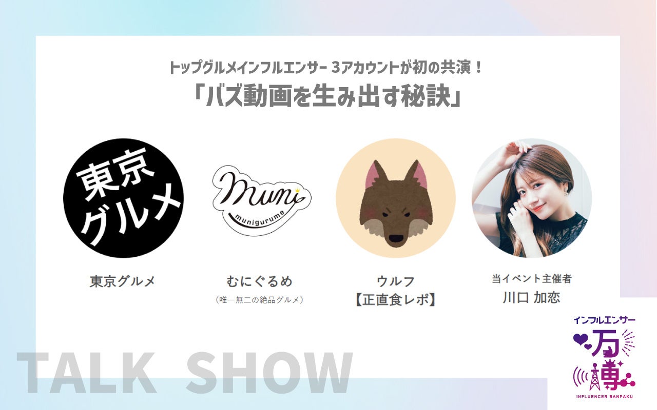 今回、トークショーでは『バズ動画を生み出す秘訣』をテーマにトップグルメインフルエンサー「東京グルメ」「むにぐるめ(唯一無二の絶品グルメ)」「ウルフ【正直食レポ】」の3名が登壇します。