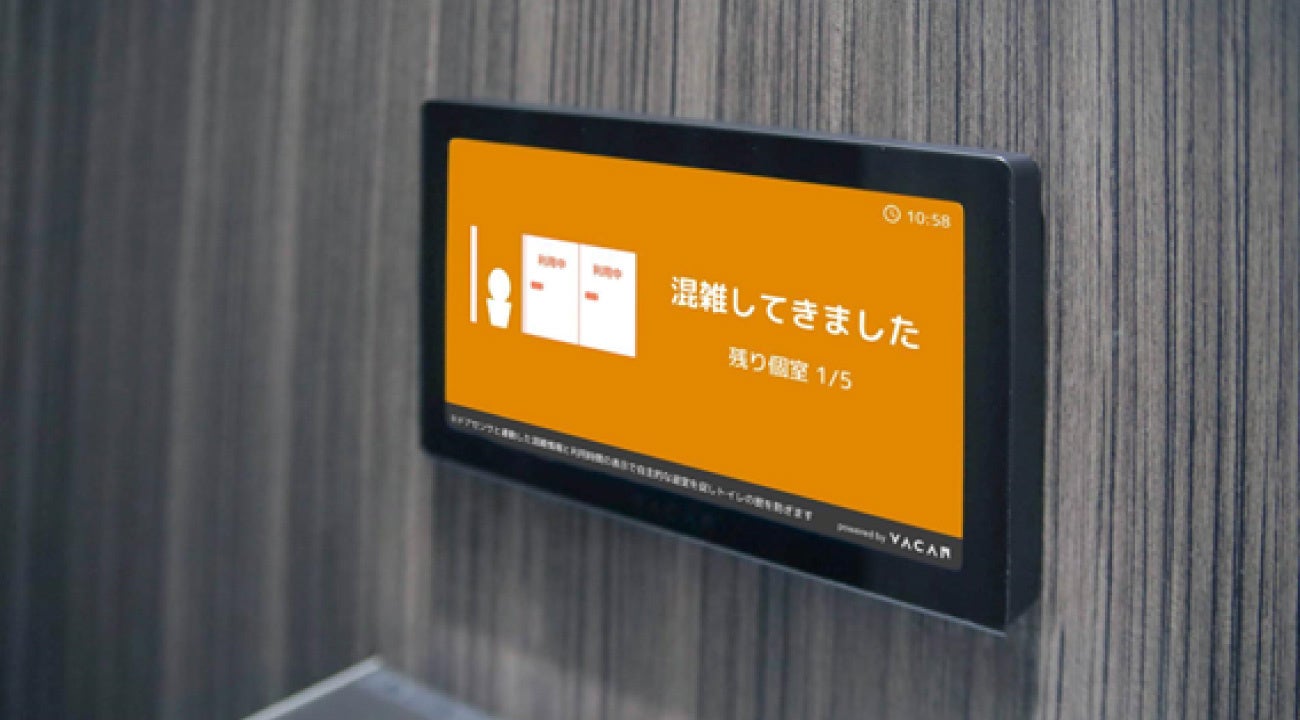 混雑具合に応じてサイネージの表示コンテンツをを自動で調整するといった、バカンがこれまでに蓄積してきた技術やノウハウから生み出した特許技術(出願中含む)を多数用いることで、トイレの混雑抑制とメディア化を実現しています。全国約9,400個室に導入されています。