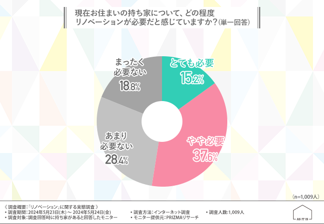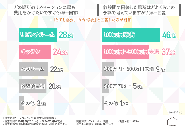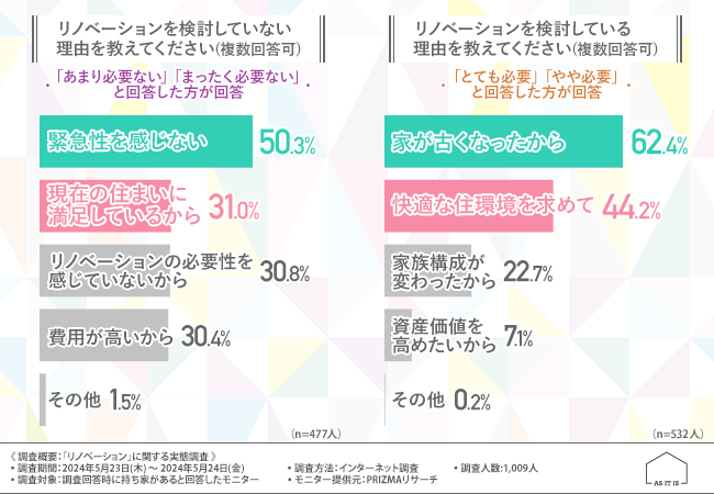 そこで今回、「あるがままに自由で豊かな暮らしを提供したい」つくば・渋谷・水戸の工務店『株式会社AS IT IS』(https://asitis.ibaraki.jp/)は、持ち家を持つ方を対象に、「リノベーション」に関する実態調査を実施しました。