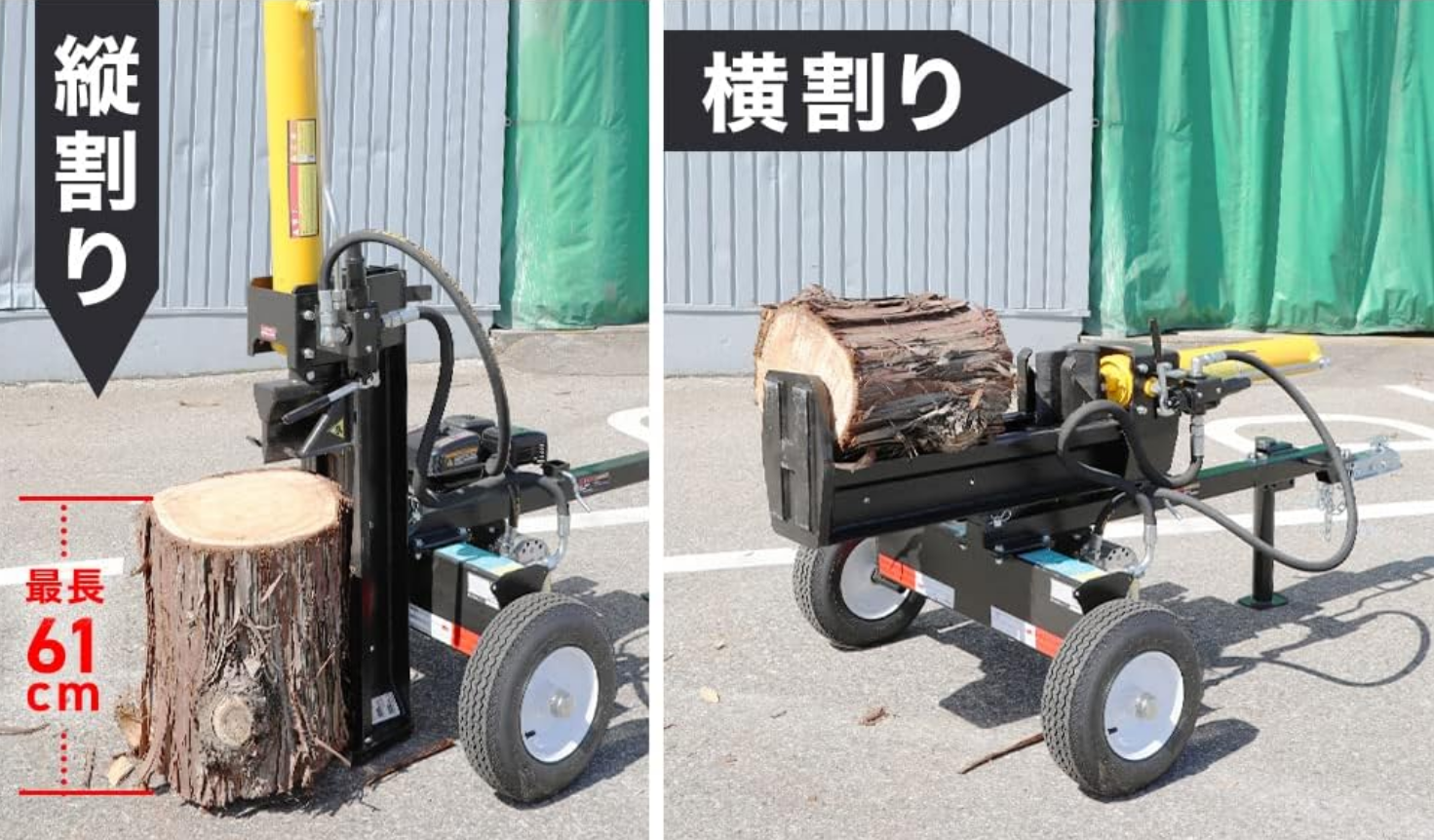 エンジン薪割り機22t(HG-MKWR22T)の最大薪割り可能径は61cm。火持ちする薪として人気の広葉樹(ケヤキ、ナラ、クヌギ)はもちろん、針葉樹(スギ、ヒノキ、マツ)もレバー操作だけで簡単に割ることができますので、斧などで行う手作業に比べ、格段に体への負担が軽減されます。