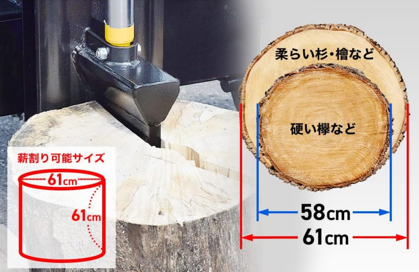 ■最大薪割り可能径61cm。ハイパワーで大径木も力強く破砕。