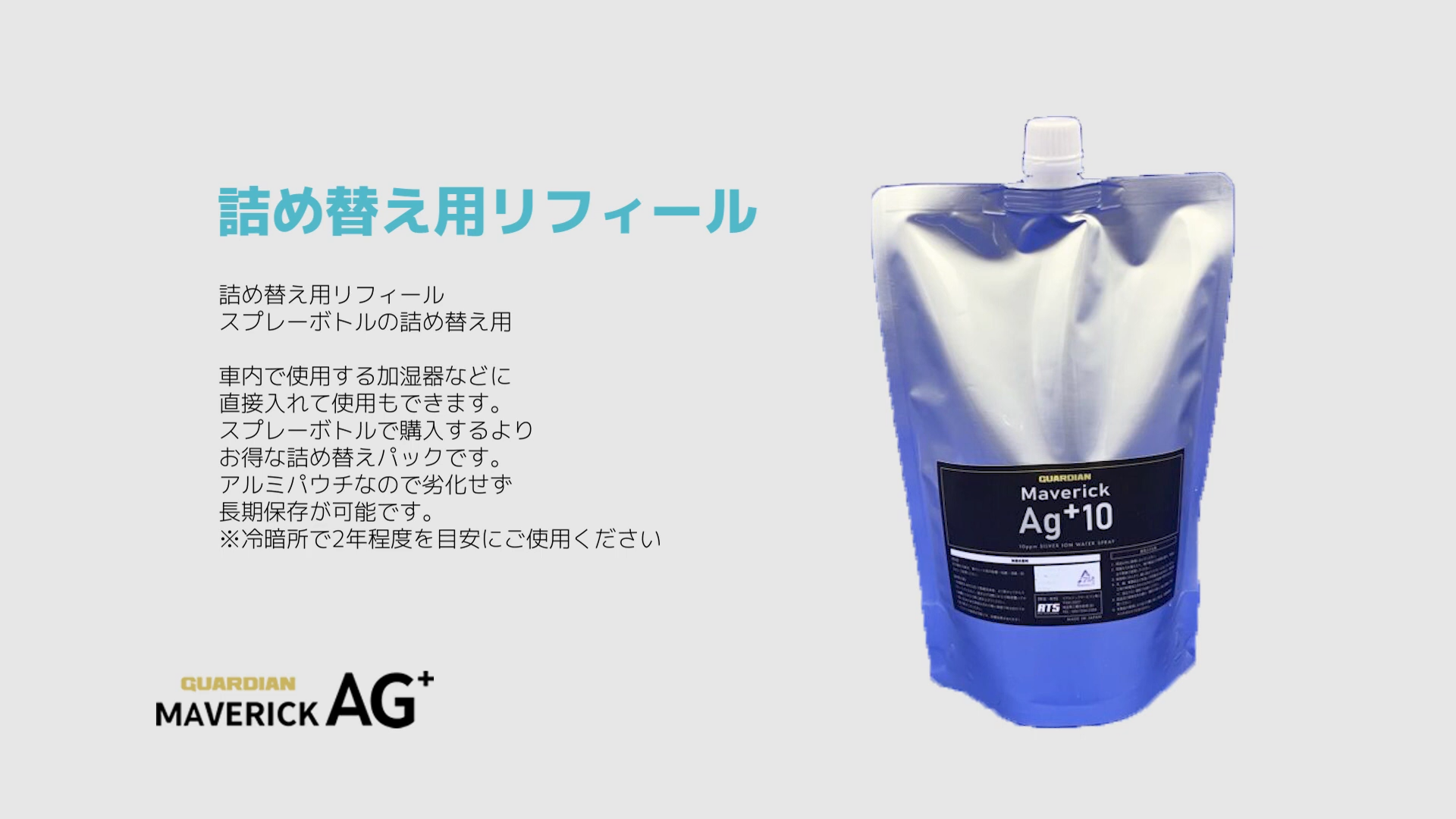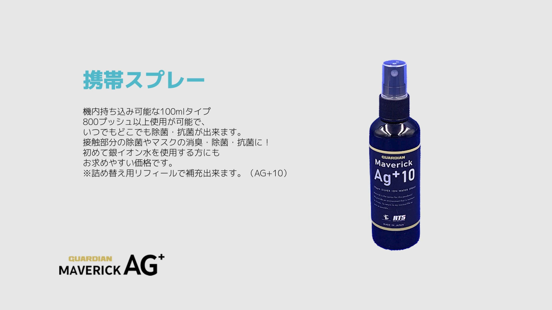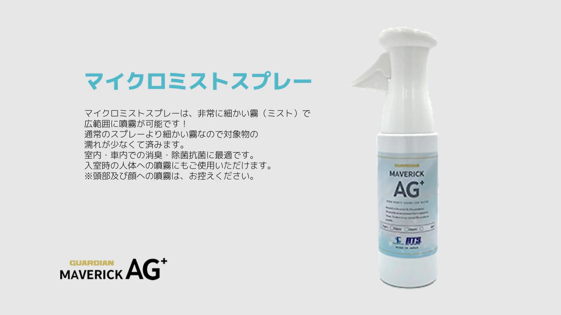 MAVERIC AG+で使用されている銀イオン水は、ウィルスも通さない目の細かいフィルターを通した高純度純水に銀イオンが水に溶け込んだものです。国内自社工場で100%自社生産を行っています。