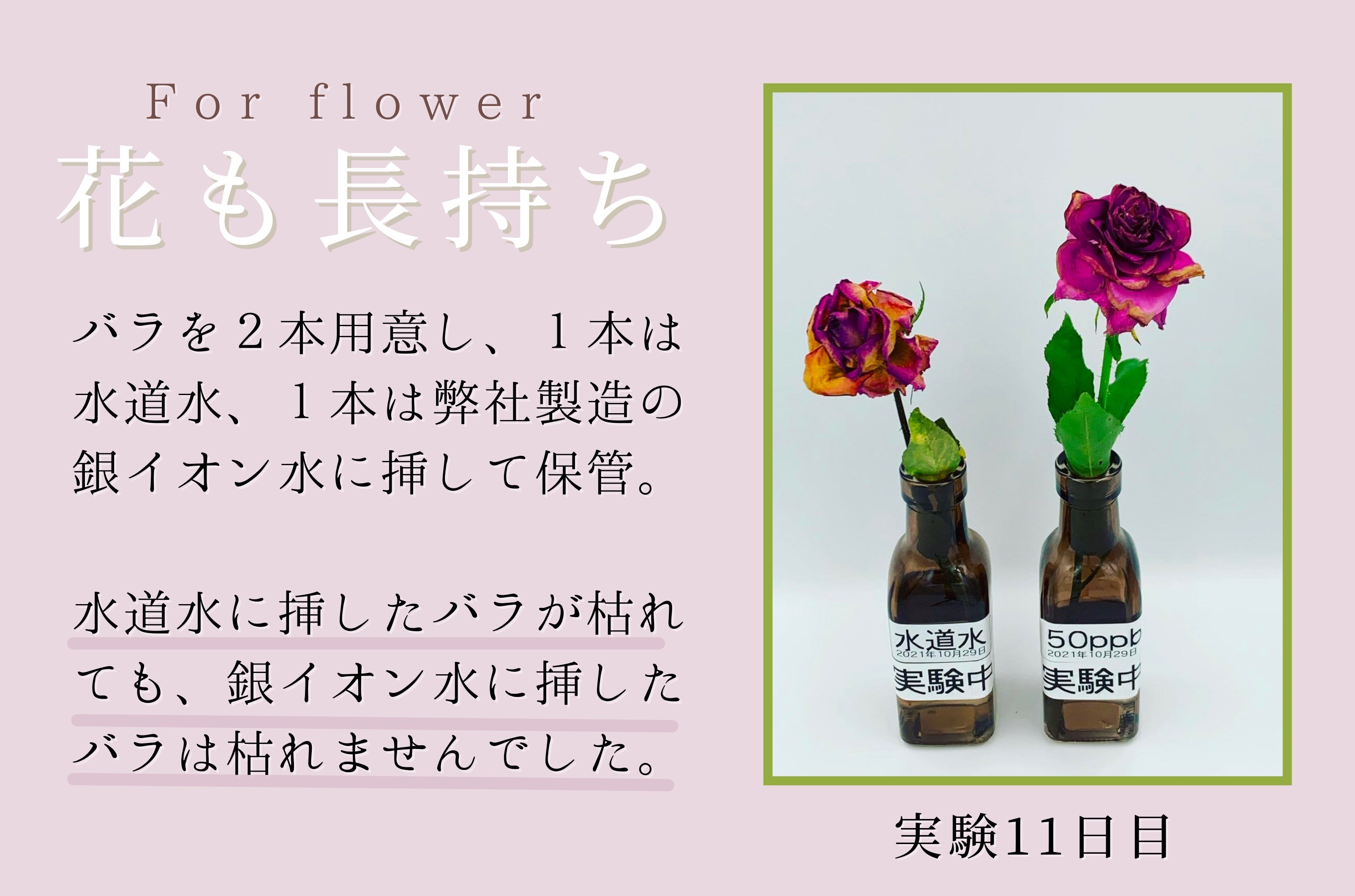 11日後には水道水に挿したバラは枯れましたが、銀イオン水に挿したバラは枯れませんでした。