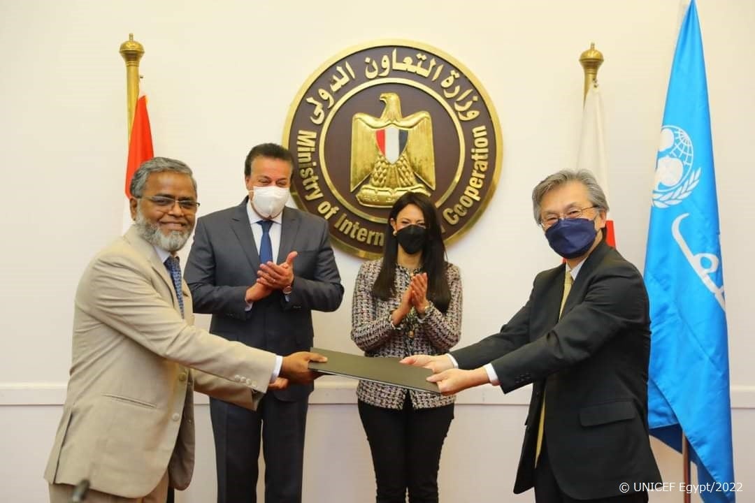 日本政府とUNICEFは、エジプト国際協力省において、新たな無償資金協力「新型コロナウイルスワクチン接種拡大計画」に関する書簡の署名と交換を行いました。