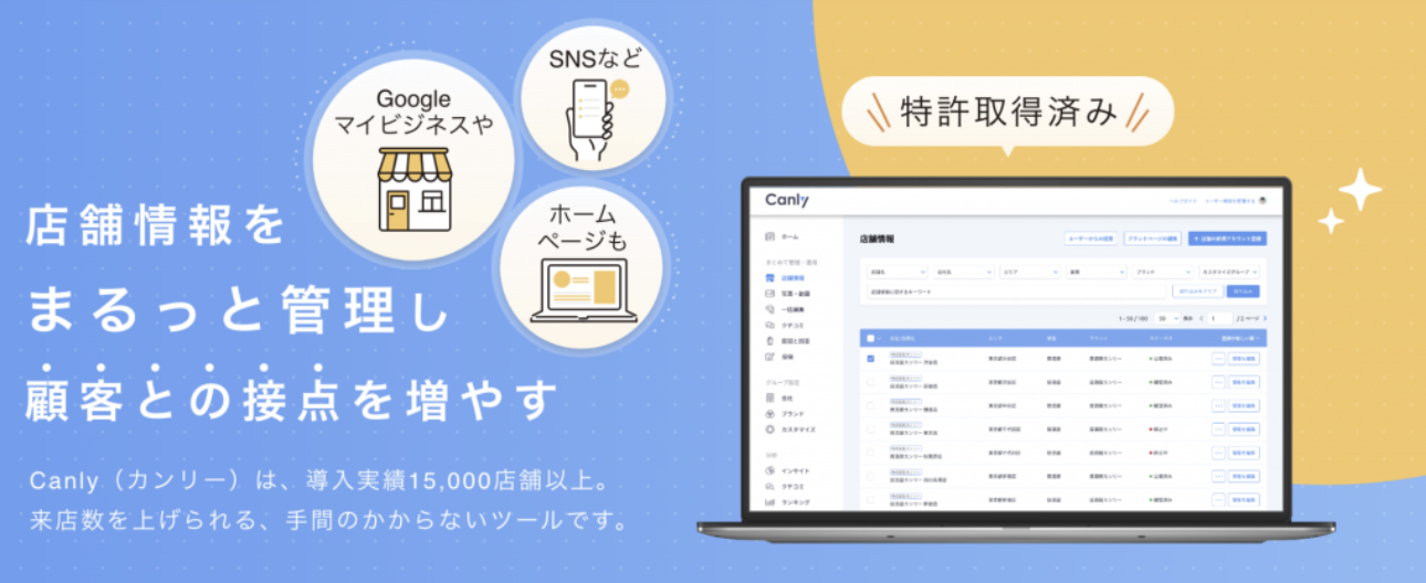 株式会社カンリー様はGoogleビジネスプロフィールやYahoo!プレイス・HP・SNSアカウントを一括で管理することで運用コストの削減を実現できるSaaSツールを提供しています。