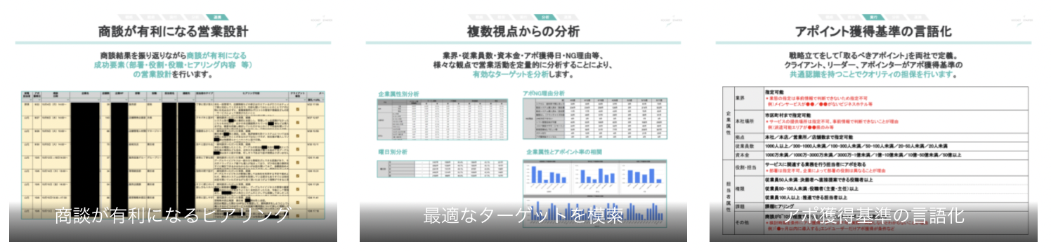 アポイント数や品質は「人」と「仕組み」に依存するからこそ、No.1経験があるトップアポインターが専属で担当し、再現性を追求したメソッドをもってクライアントの事業拡大を加速します。