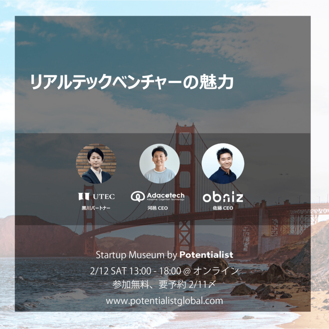 リアルテックのスタートアップをテーマにしたセッションです。サイエンス・テクノロジー分野に特化したVCであるUTECと、リアルテック領域で急成長中のスタートアップであるobnizとAdacotechをお招きし、革新的なディープテック領域について語っていただきます。