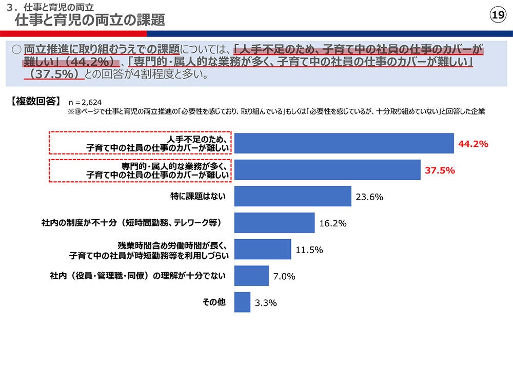 人手不足のために子育てをしている社員の仕事のカバーが難しいと感じている企業も多く、さまざまな課題がお互いに影響し合っている状態です。