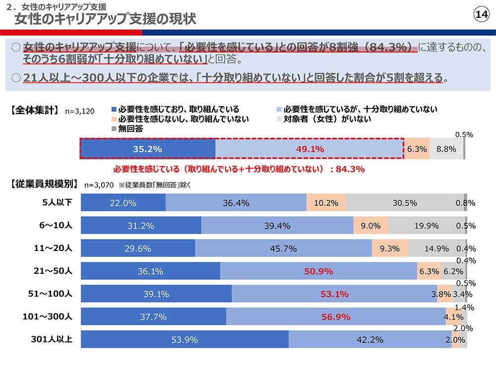 また、女性のキャリアアップ支援に関しては必要性を感じている企業が8割(84.3%) を越えているものの、そのうち十分に支援に取り組めていない企業が6割を超えています。