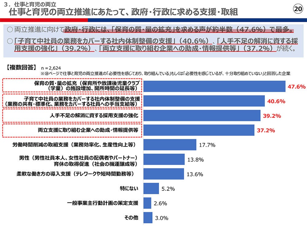 さらに、仕事と子育ての両立を推進するために、政府・行政に対して保育の質や量の拡充を求める声が約半数(47.6%) あることから、子育て世帯への保育に関するより充実したサポート体制が求められていることがわかります。