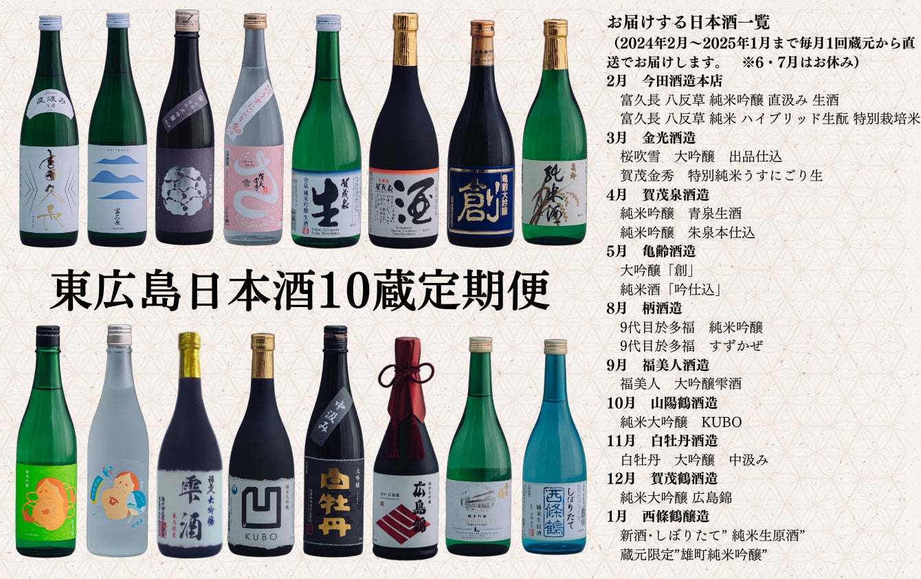 東広島市内にある10の蔵元の「日本酒を通じ全国の皆さまと繋がり、絆を作りたい」という思いを伝えるため、蔵元・杜氏が厳選したふるさと納税返礼品「東広島日本酒10蔵定期便」を提供します。限定50セットで、期間限定・予約のみの受付となります。