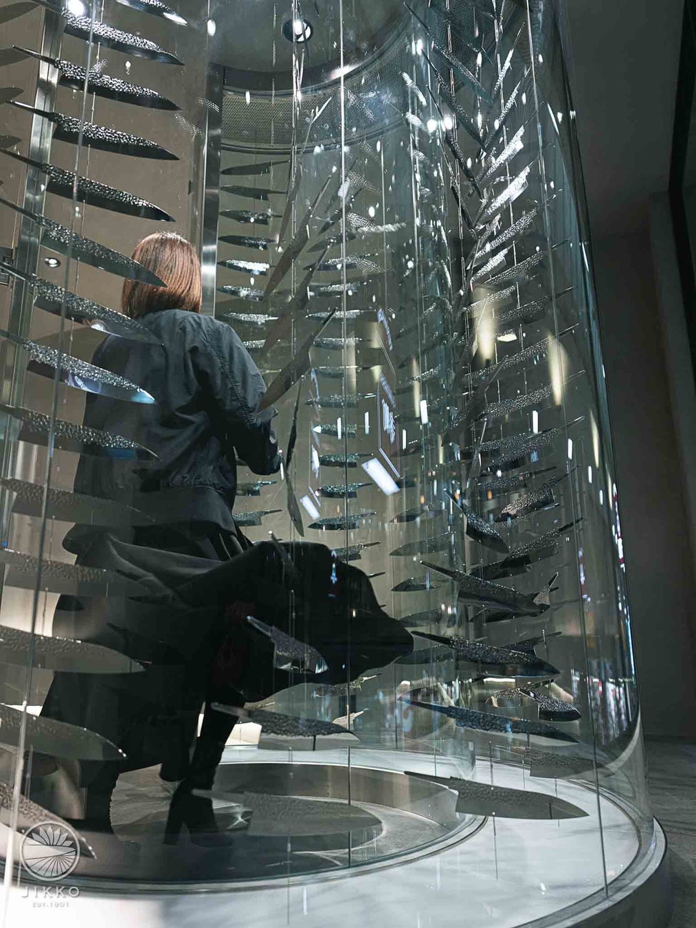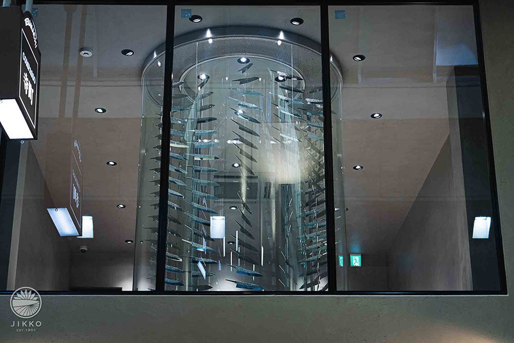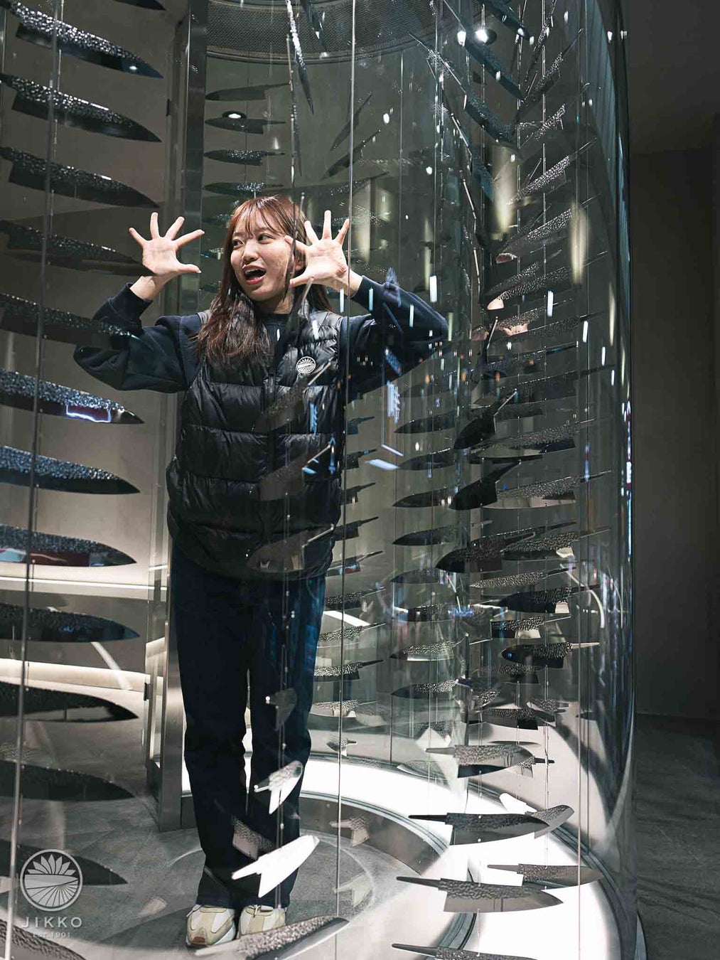 180本の包丁を鏡面に仕上げて、包丁シャンデリアのようにしています。それをガラスで覆い「包丁タワー」にしています。