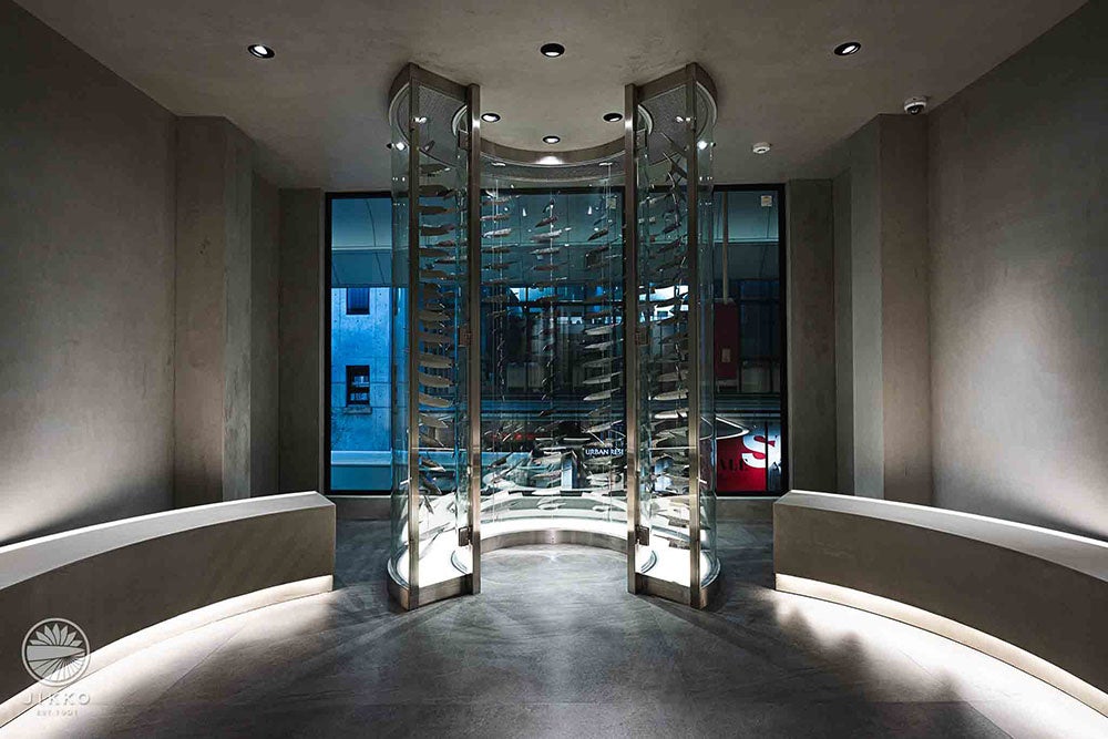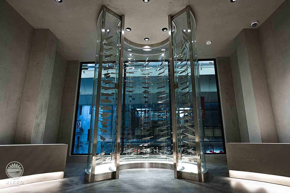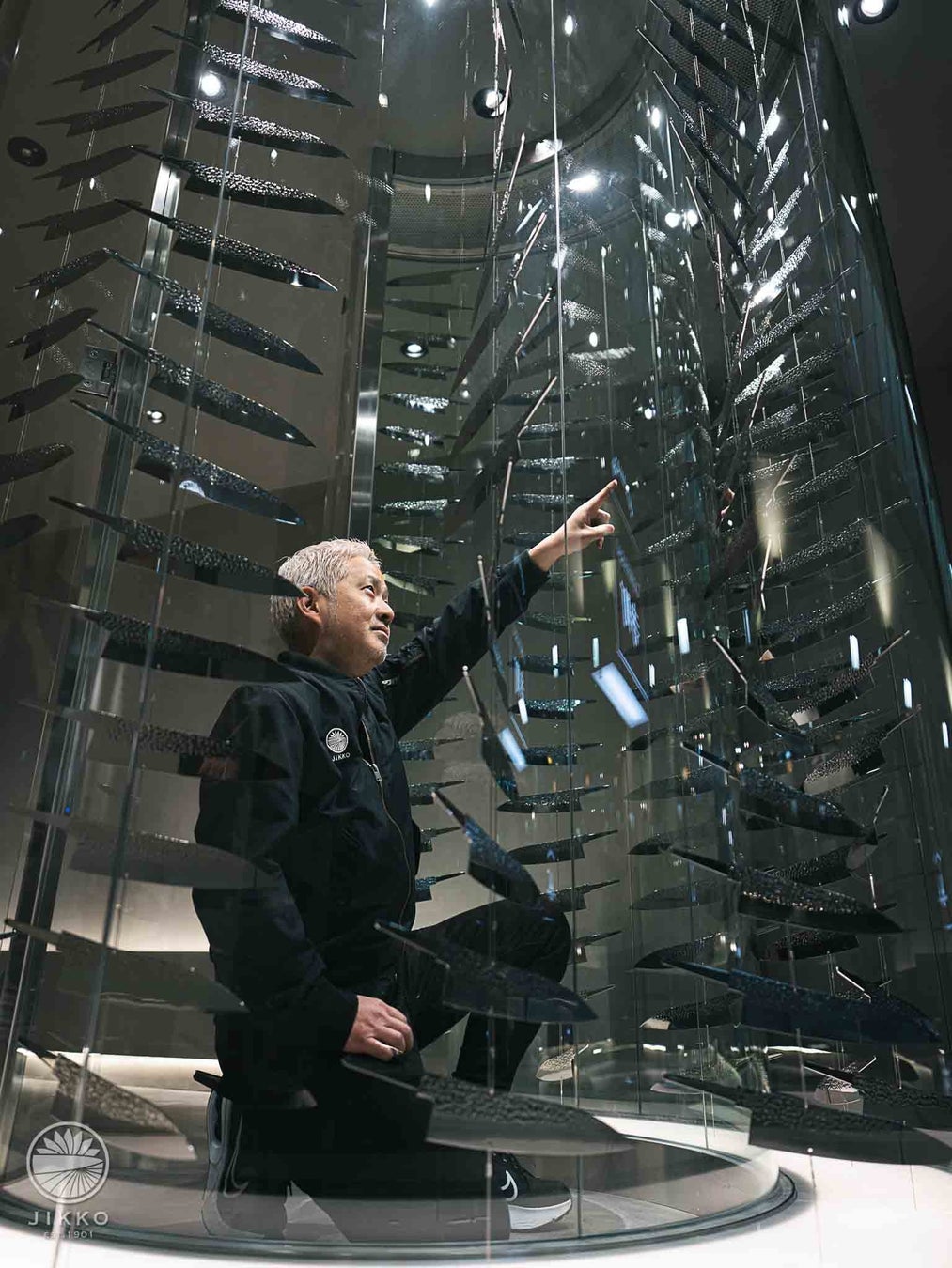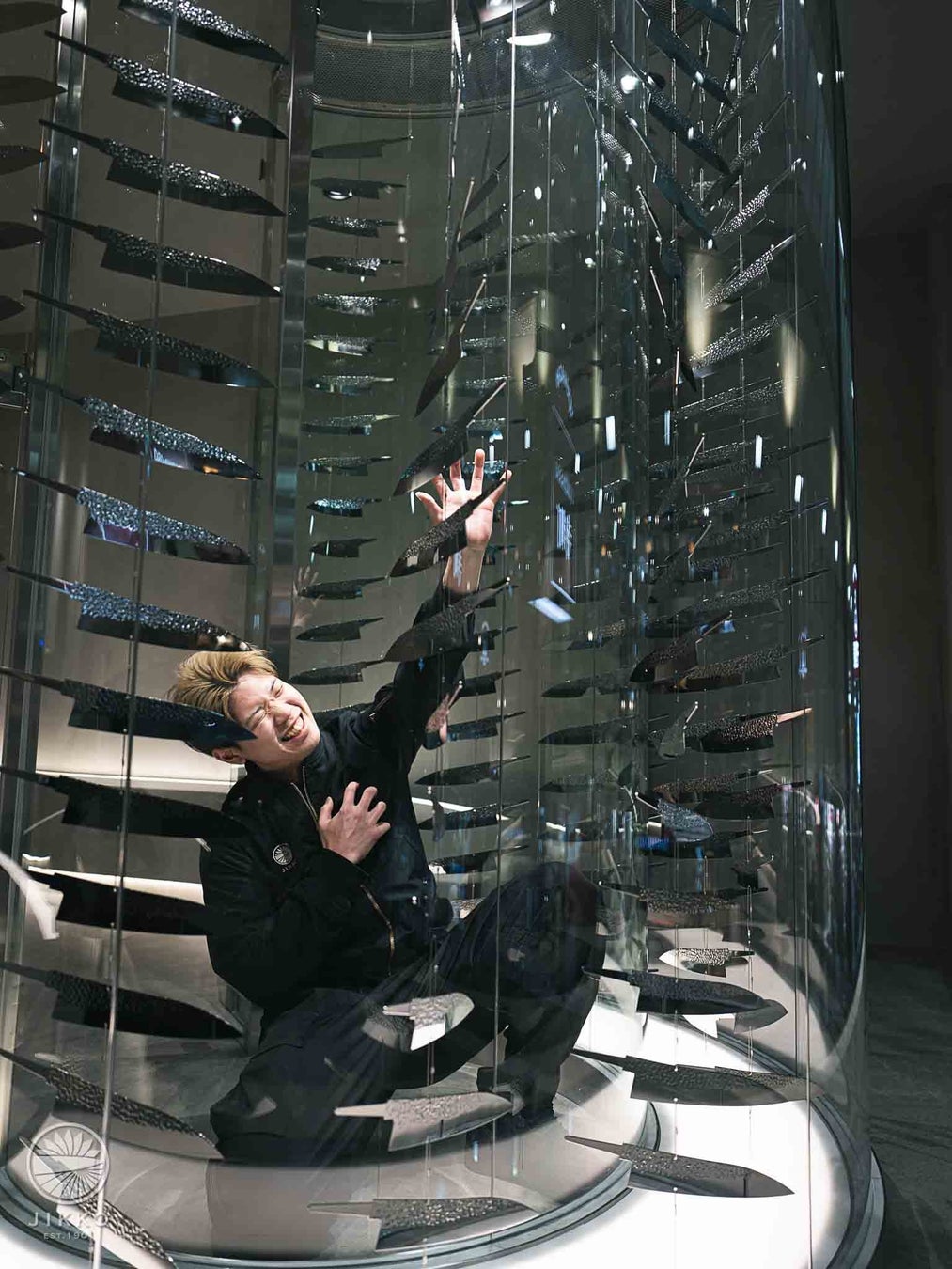 180本の包丁を鏡面に仕上げて、包丁シャンデリアのようにしています。それをガラスで覆い「包丁タワー」にしています。