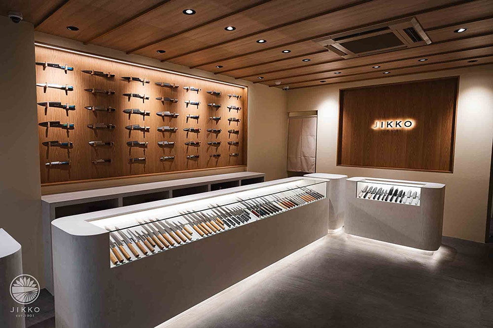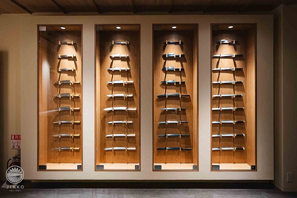 また、カウンターの反対側には實光刃物のブランドの銀座シリーズ、祇園シリーズなどの片刃包丁を陳列しています。
