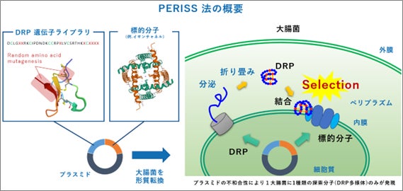 PERISS法は、膜タンパク質に作用するDRPの探索を可能にする進化分子工学をベースとしたハイスループットスクリーニング技術です。創薬標的である膜タンパク質とDRPを大腸菌内で共発現させ、標的膜タンパク質に結合したDRPをコードするプラスミドを回収し、DNA配列の解析を行うことで、標的膜タンパク質結合性のDRPのアミノ酸配列を同定することができます。本手法は、mRNAディスプレイやファージディスプレイ等の他の進化分子工学的手法ではこれまで創薬が難しいとされてきた膜タンパク質であるイオンチャネルやGPCR、トランスポーターなどの膜タンパク質を標的とすることが出来る点で優位性があると言えます。また、従来のケミカルライブラリからのハイスループットスクリーニングとは桁違いの膨大なサイズのライブラリから、非常に短期間で標的膜タンパク質結合性のDRPを探索できることも大きな利点です。
