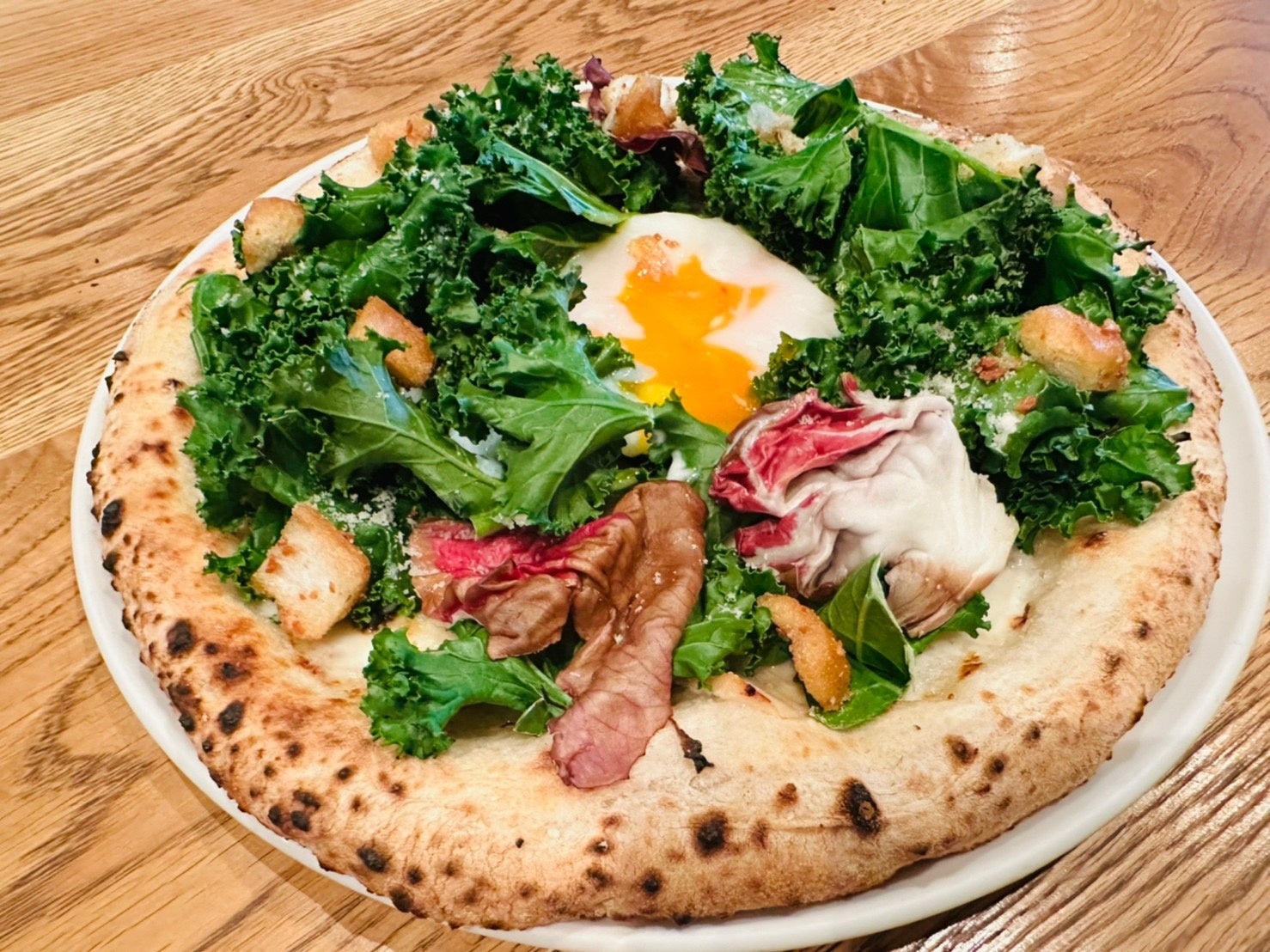 燻製した気仙沼産のメカジキを使ったクリームソースのピッツァ。仕上げに、栗原産のケール、トレビスをのせて軽く火を入れています。食感のアクセントに、ニンニクオイルでカリっと炒めた宮城・登米の油麩のキューブを散らしています。
