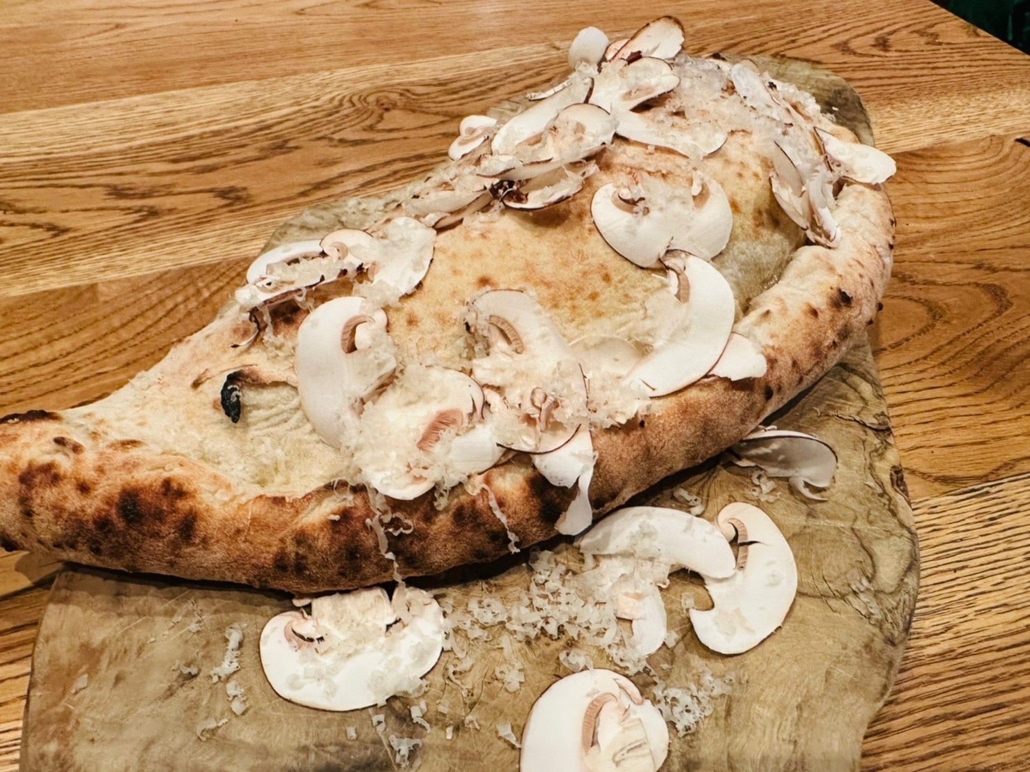 八幡平のマッシュルームのデュクセル(きのこをみじん切りにしてソテーしたペースト)と、肉厚の安比まいたけ、オリーブ、ケッパー、エビとともに生地に包んで焼くピザ「カルツォーネ」に。切った際にまいたけの香りが広がります。