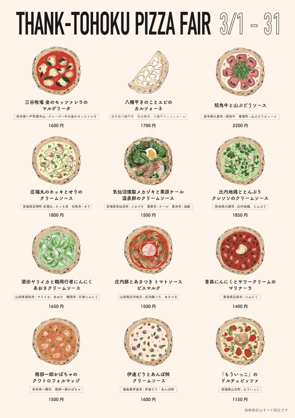 内容:通常のレギュラーメニューに加え、期間中は東北素材の限定ピッツア12品を提供(通常メニューのピッツァの提供はお休みになります)