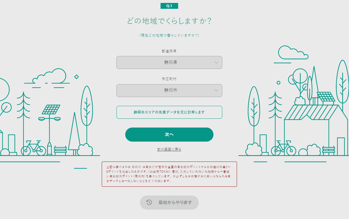 アクセスいただき、居住地や普段の水・電気使用量の数値をご記入ください。