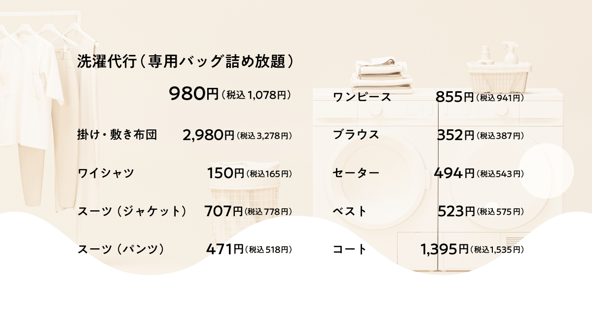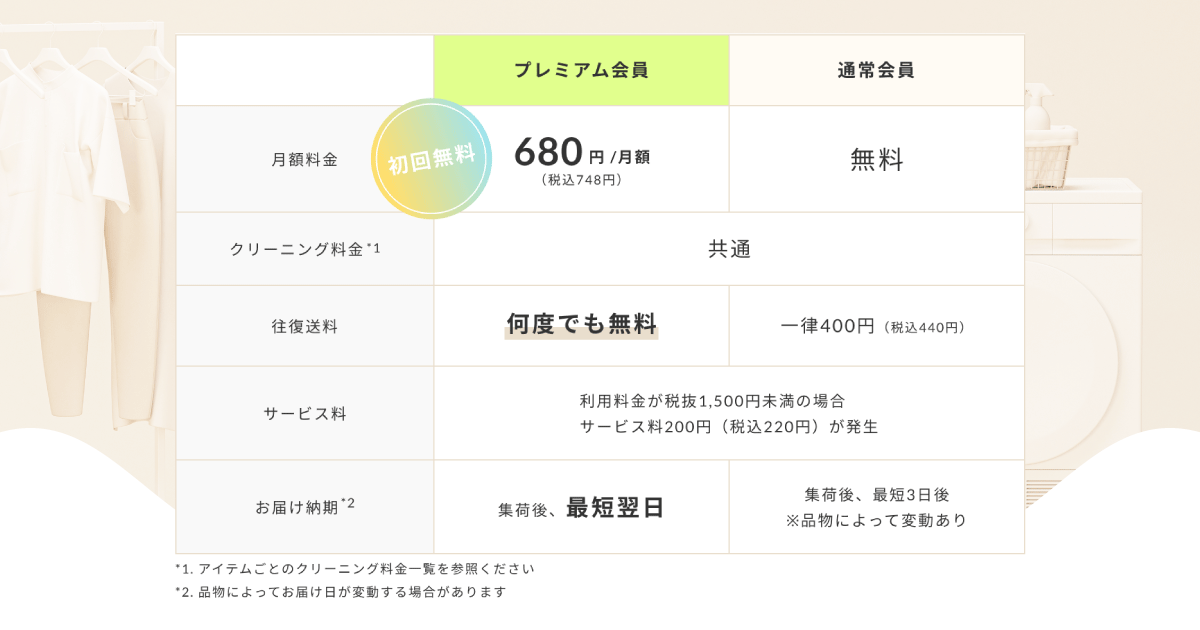Yシャツ150円(税抜)、布団2,980円(税抜)と、街のクリーニング店と比較しても同等以下での価格を宅配クリーニングで実現しています。また、Tシャツやタオルなど家庭の日常的なアイテムを対象にした洗濯代行サービスは、コインランドリーと変わらない980円(税抜)で提供しております。さらに、プレミアム会員登録(月額:680円(税抜))で往路送料が何度でも無料になりますので、お財布に優しく、日常使いしやすい宅配クリーニングとなっております。