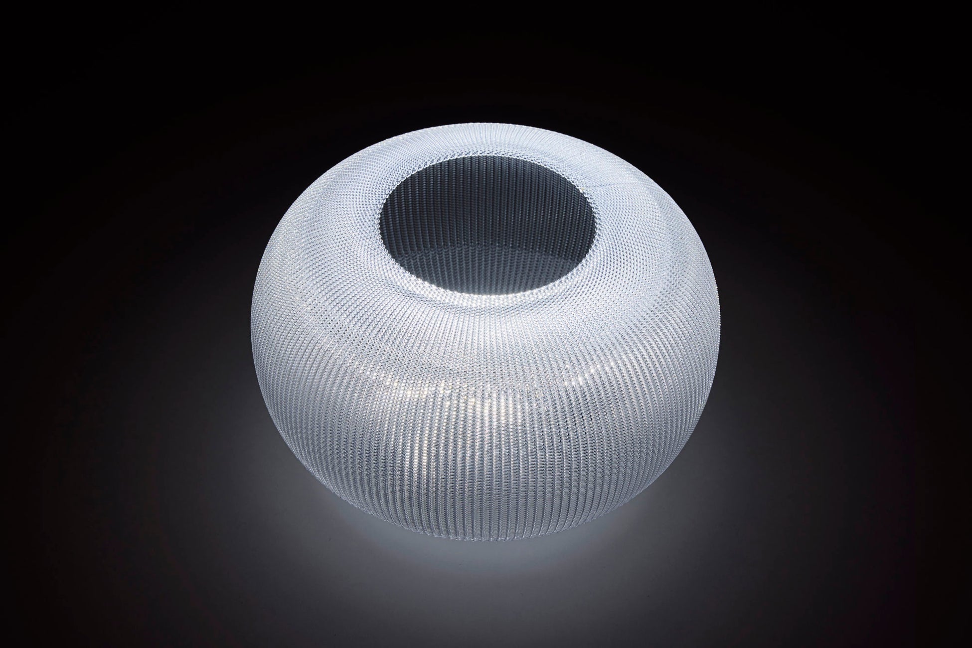 形を織りなす無数のラインは、一見すると工業生産の精密さそのものです。しかし、その規則正しさの中に、意図的に「手仕事ならではの揺らぎ」を形式的要素として組み込みました。