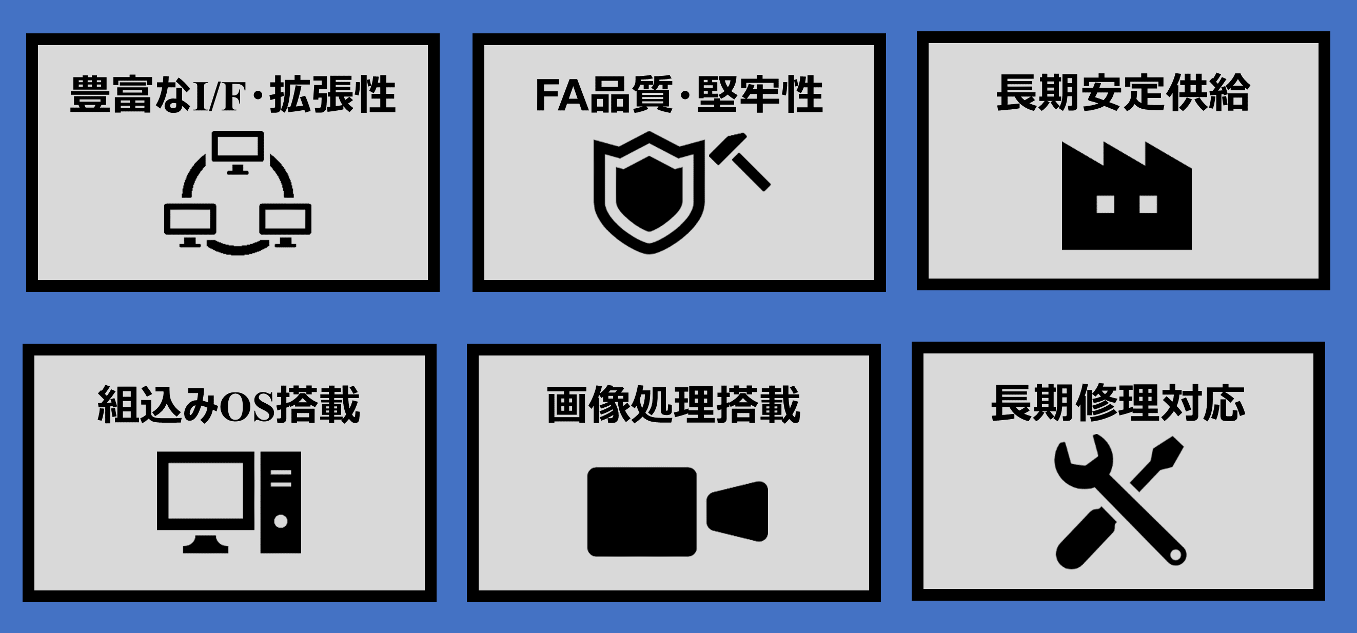 画像処理コントローラは、民生品の “パソコン” と比較して、「豊富なI/F・拡張性」「高いFA品質・堅牢性」「長期安定供給」「組み込みOS搭載」「画像処理搭載」「長期修理対応」といった点で、画像処理用途に特化した優位性があります。