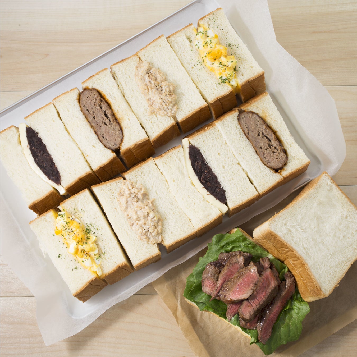 ⼤⼈気のタマゴサンドやアンバターに加え、丸ごと1つ⼊ったハンバーグやたっぷりステーキなど様々な具材をぶ厚くサンド。