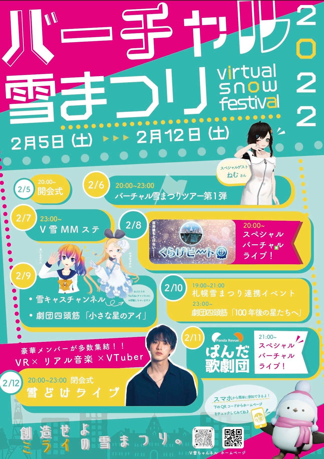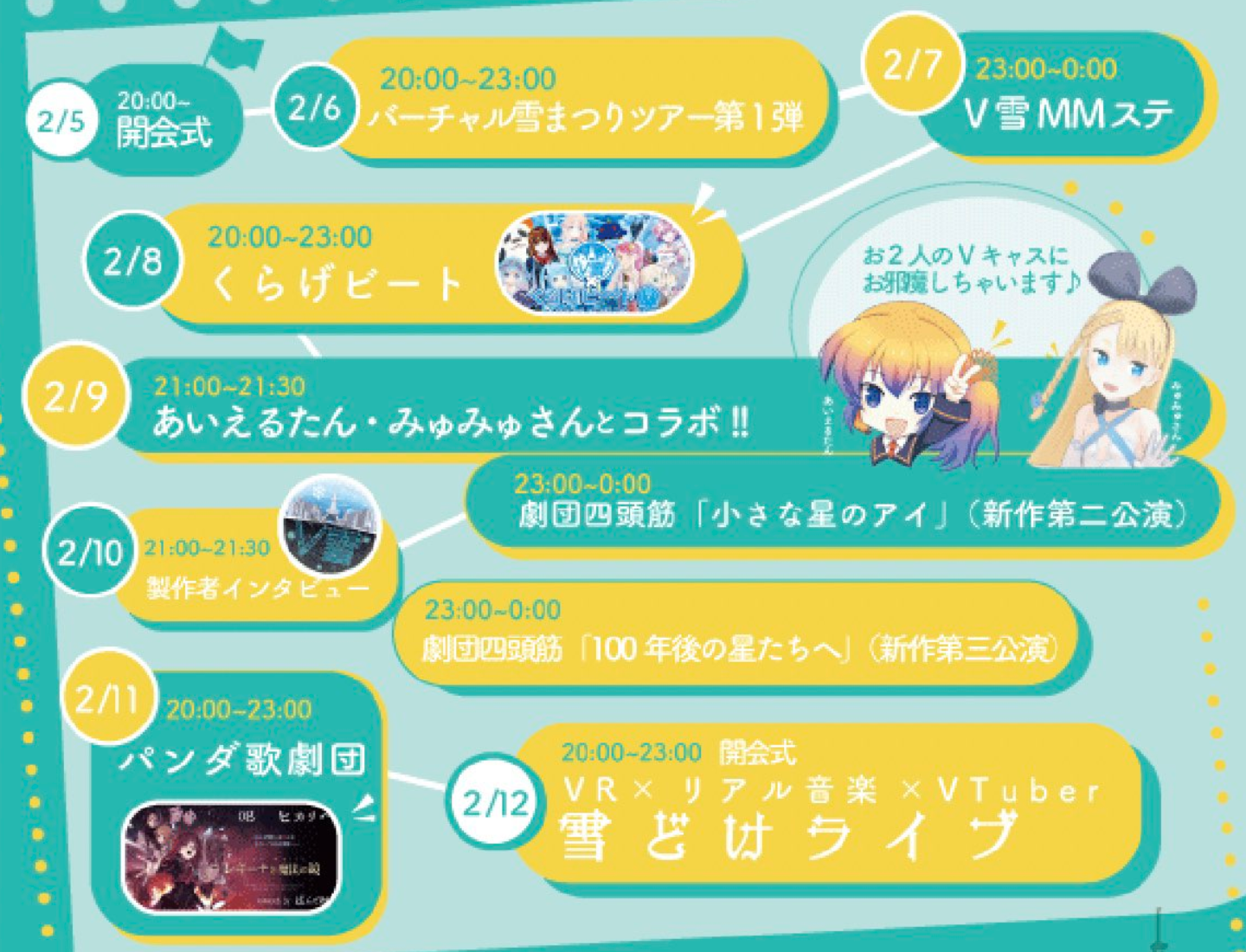 開会式や閉会式、バーチャル雪像会場や雪まつりワールドを巡るツアー配信(Youtube LIVEで配信)、アーティストによるバーチャルライブや他のVRコミュニティとのコラボイベントなど各種イベントを開催いたします。