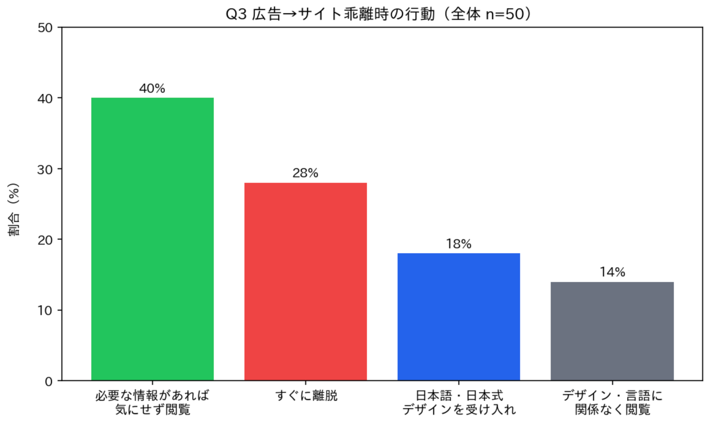 年代差が最も顕著に表れた設問です。15〜19歳の即離脱率はわずか12.5%ですが、45歳以上になると40%に跳ね上がります。45歳以上をターゲットとする商材(旅行、プレミアム食品、ライフスタイルブランドなど)では、広告クリエイティブとランディングページの言語・デザイン一貫性が収益に直結します。