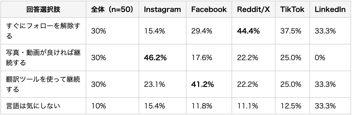 プラットフォームごとの英語非対応への許容度には最大3倍の差があります。Reddit/Xユーザーは44%が即離脱と最も拒絶感が強く、一方でInstagramユーザーは15.4%と最も寛容で、46.2%が「写真が良ければ継続」と回答しています。
