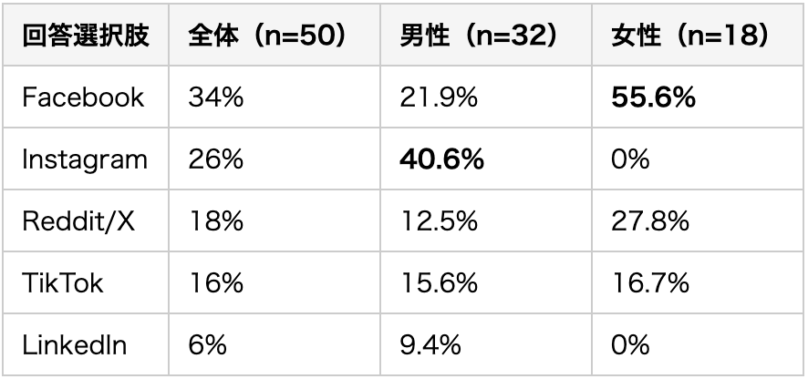 最も驚くべき発見は男女の利用SNSの完全な分岐です。男性はInstagram最多(40.6%)に対し、女性のInstagram利用者はゼロ。女性はFacebook一択(55.6%)という構造になっています。これは「ビジュアル訴求ならInstagram」という一般論が、女性ターゲットには全く当てはまらないことを示しています。