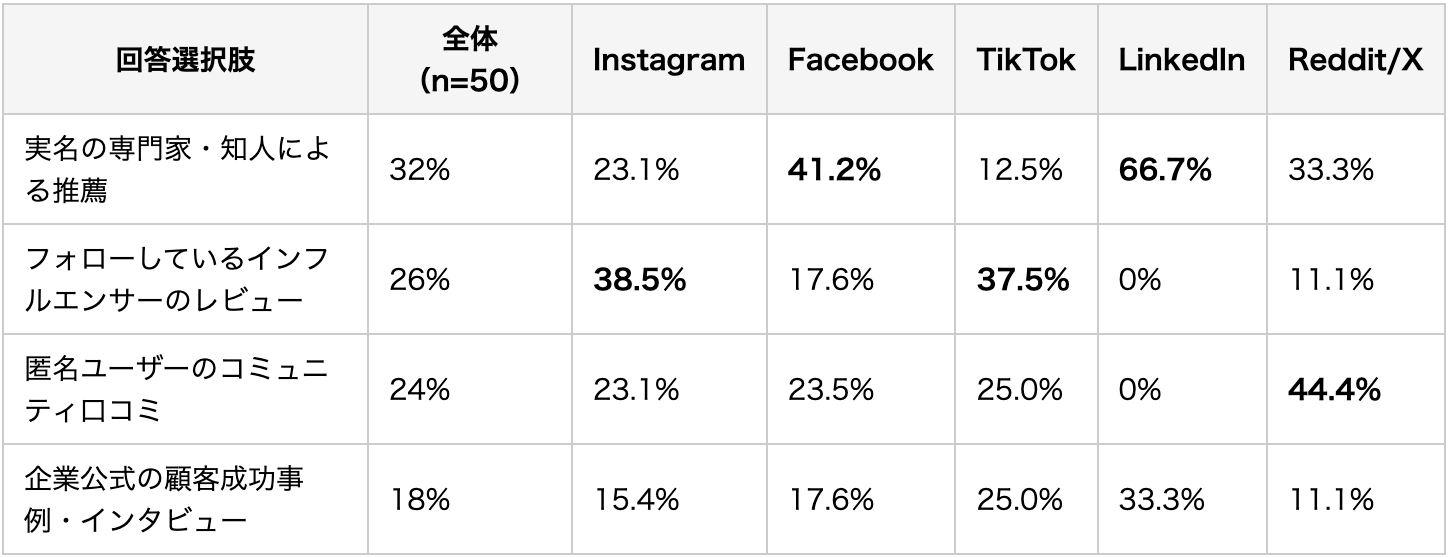 プラットフォームごとに信頼源が明確に分化しています。Instagramではインフルエンサー(38.5%)、FacebookとLinkedInでは実名専門家(41.2%・66.7%)、Reddit/Xでは匿名口コミ(44.4%)が最も信頼されます。マルチプラットフォーム展開では、プラットフォームごとに異なる信頼源を活用した独立した戦術設計が必要です。