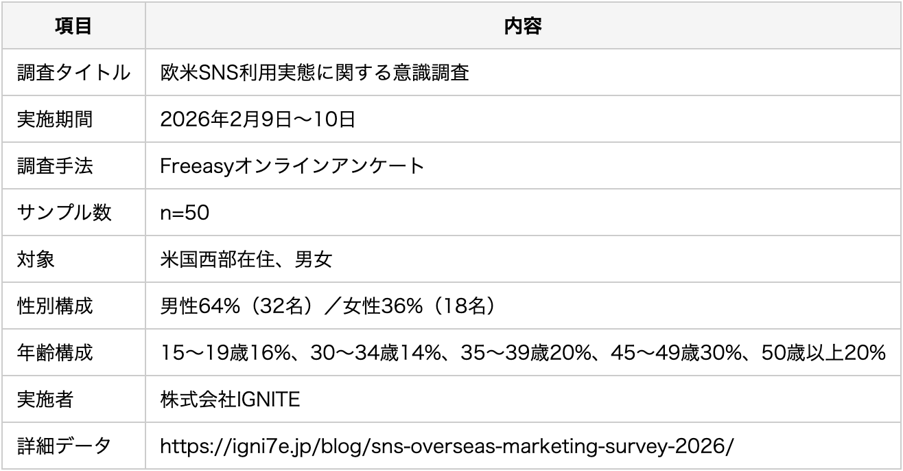 株式会社IGNITE(所在地:〒530-0013 大阪府大阪市北区茶屋町16-1 H1O茶屋町 810)は、2026年2月9日〜10日、米国西部在住の男女50名を対象に「欧米SNS利用実態」に関するオンライン調査を実施しました。調査の結果、(1)女性回答者のInstagram利用率がゼロ(Facebook一択55.6%)、(2)企業公式発信の信頼率が全形式中最下位18%、(3)45歳以上のユーザーは広告→LP乖離で40%が即離脱——という3つの発見が、多くの日本企業が持つ欧米SNS戦略の「思い込み」を根底から覆しました。
