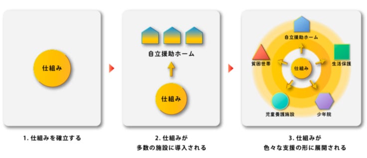 今回の事業は、調べた限り日本で初となります。前例のないこの取り組みの最初のドミノを倒すことで、家庭を頼れない若者、さらには、地域社会に潜在する貧困世帯や生活保護世帯、少年院・刑務所を出て帰住先がない際に入る更生保護施設、発見されないままの虐待、など、様々な環境下で「家庭を頼れない若者」にも展開することが可能となります。自立に向けた支援として実効性が確認されれば、国や自治体などの公的機関による制度化・事業化への道筋が見えてきます。