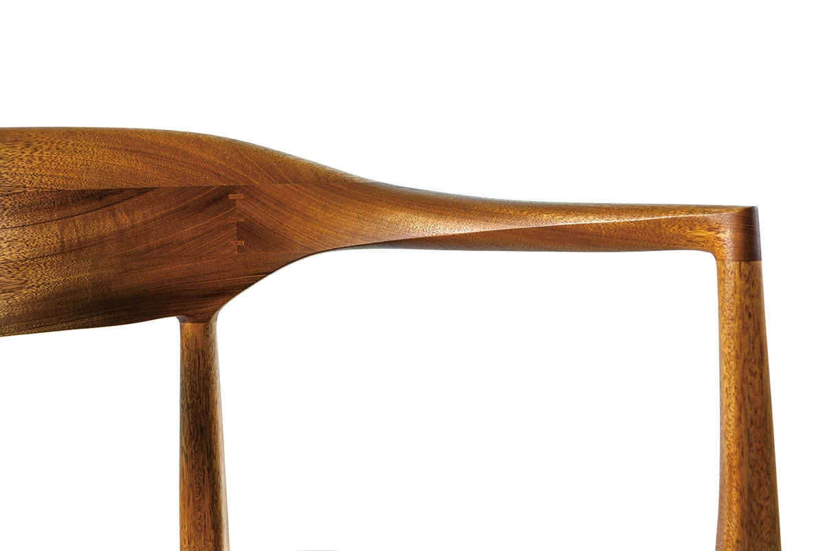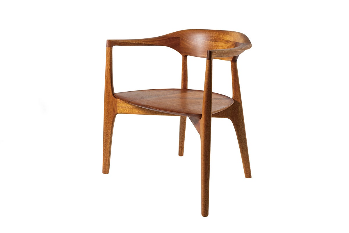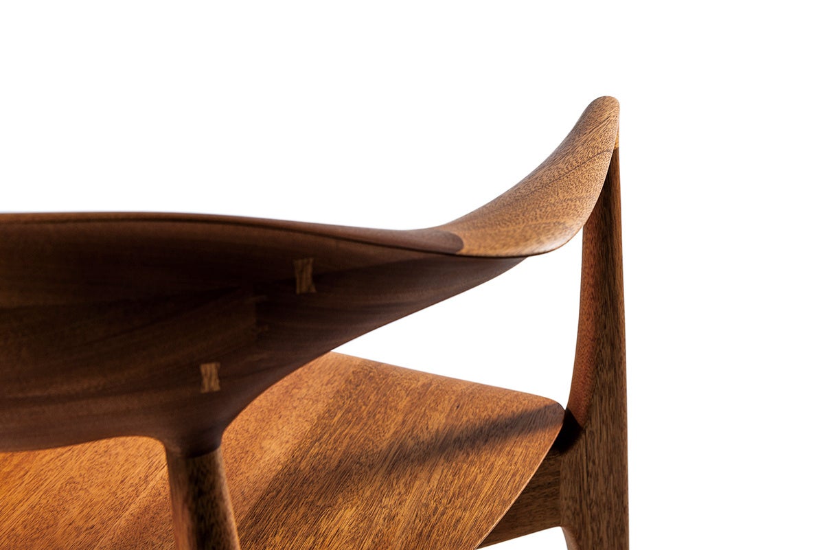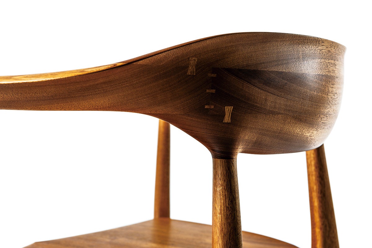 背もたれからアームにかけて滑らかな曲面とエッジの効いたラインが特徴の cocoda chair。一つ一つ手道具を駆使して製作し 一点物のクオリティでありながら、製品として展開している。機械では生み出せない美しい三次曲面が、身体にフィットし究 極の座り心地を追求した椅子となっている。どこから眺めても完璧な美しさと色気を感じる椅子。デザインと製作:松岡茂樹