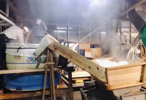 桜川酒造で行われている伝統的酒造り。昔からの木の道具を今も大切に使っております。