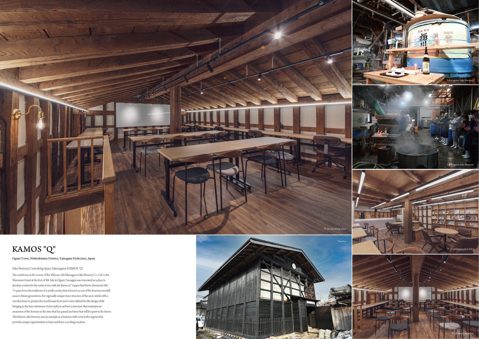 私たちは、山形県にある小国町にある酒蔵カフェ&飯豊山麓ワーケーション拠点「カモスク®(KAMOS"Q")」を運営しています。1Fはブックマンション&カフェ、2Fは会員制ワークスペースを設けWi-Fiや各種機材を完備しつつも木の温かさを感じられる居心地の良い空間をつくり、交流拠点として多様な人が気軽に立ち寄れるスペースを運営しています。