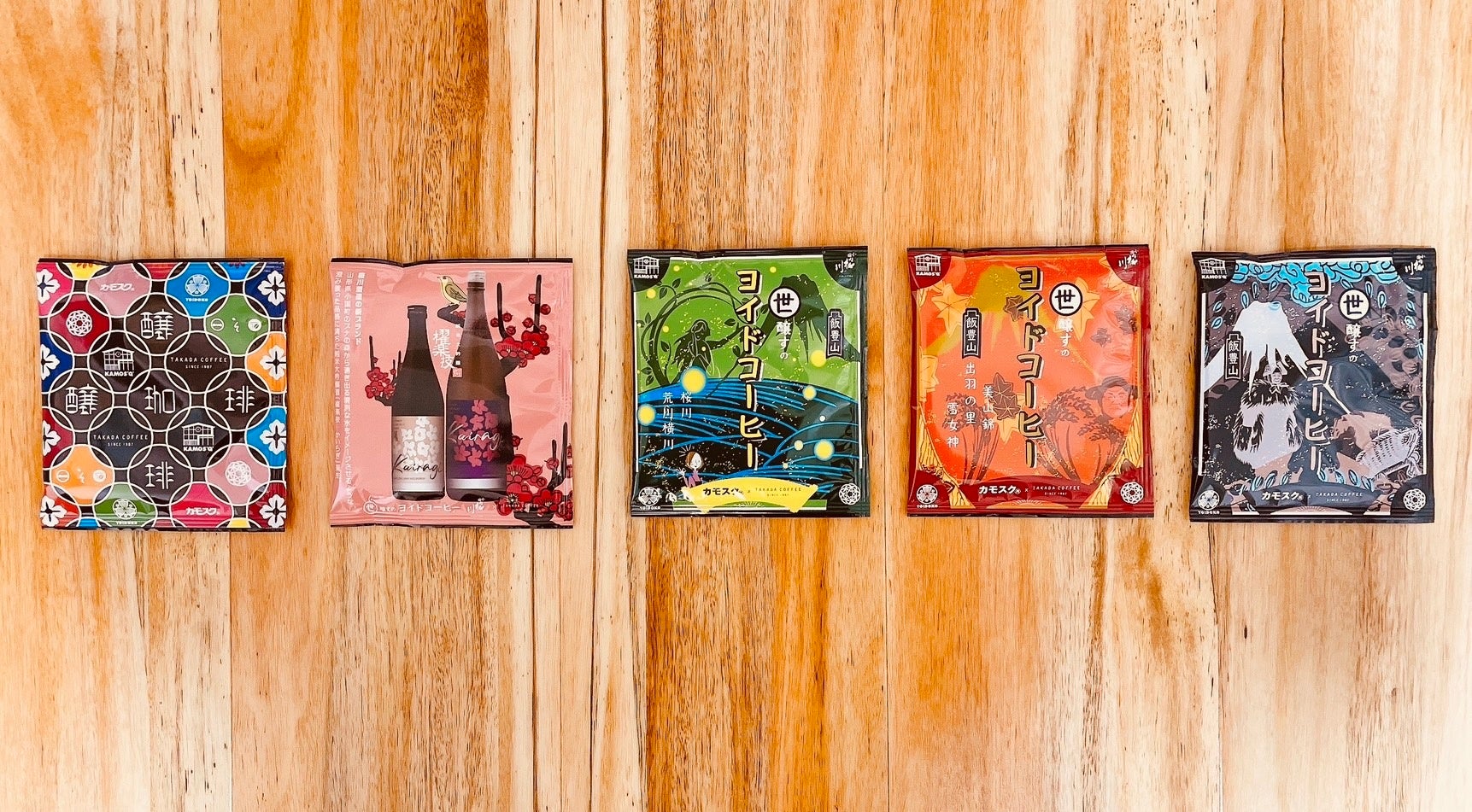 山口県下関にあるTAKADA COFFEEとコラボレーションしたドリップコーヒー「ヨイドコ―ヒー」も開発し販売しております。飯豊山麗の四季を通した自然や文化、桜川酒造新しいお酒などの地域資源をグラフィカルにデザインしました。袋のデザインは5種異なりますが、味わいは同じ。軽くて持ち運びもしやすいため、配るだけでこの地域をご紹介できるお土産としてご利用いただいています。ヨイドコ™のお泊りの際はこちらをアメニティとしてお部屋で味わっていただけます。
