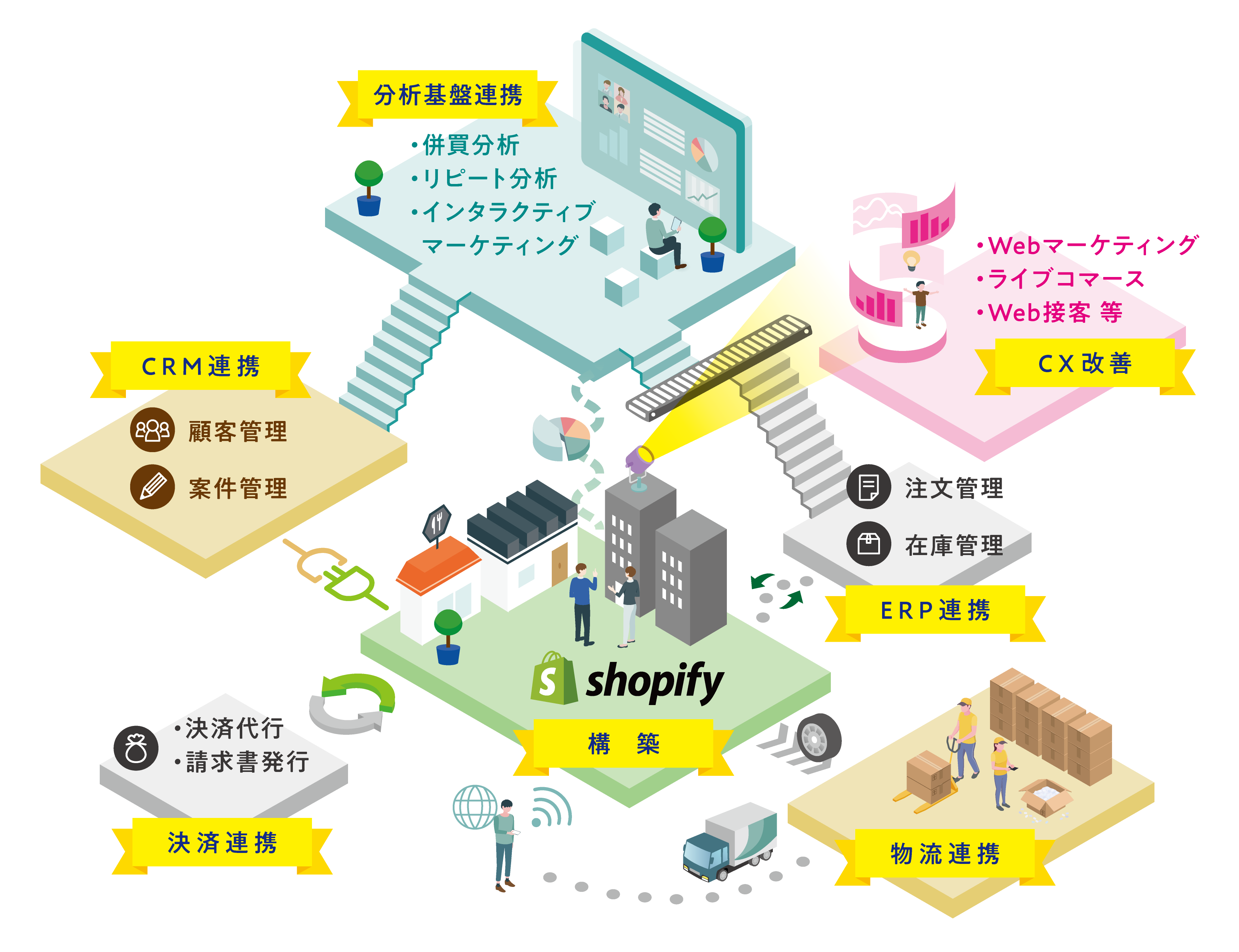 JASTは、Shopifyの導入支援はもちろん、SIerとして様々な業界で培ってきたシステム開発力と、データサイエンス分野で蓄積されたノウハウを活かし、周辺システムとの連携開発、データ分析による戦略立案のご支援、新たな顧客体験の提供等、お客様のeコマース事業のDX推進をご支援させていただきます。