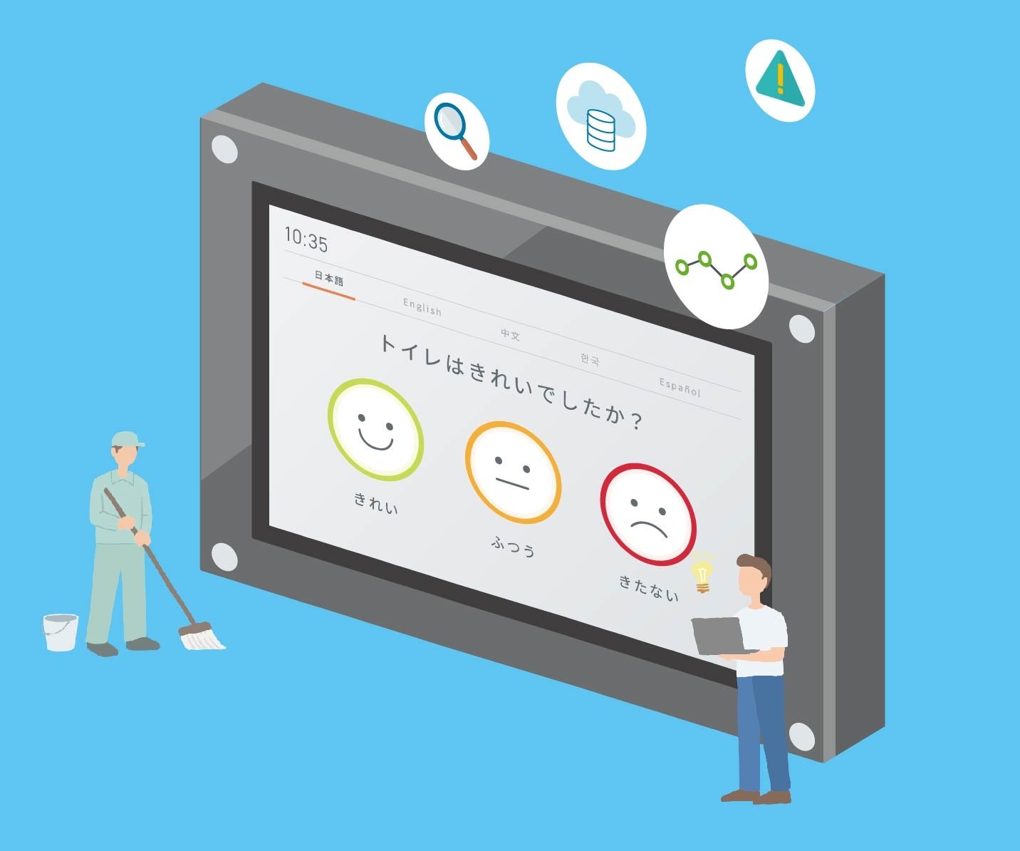 「世界一清潔な空港」として名高い羽田空港では、トイレが清潔だったかどうか「CSモニタ」でリアルタイムに収集したログデータをもとに清掃員のシフト管理を行い、顧客満足度向上にお役立ていただいています。