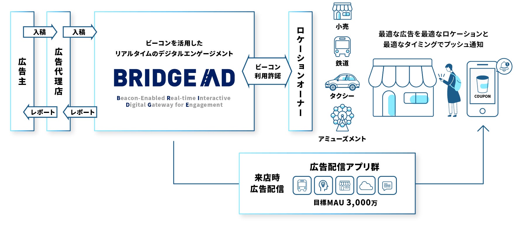 本プラットフォームは、ロケーションパートナー(広告配信場所提供者)から提供された広告配信場所(ロケーション)と、アプリパートナー(広告配信アプリ提供者)から提供された広告配信アプリを複合的に組み合わせることで、業界や企業の垣根を超えた全国規模の位置情報広告配信ネットワークの構築を実現し、10年後には売上高40億円規模の達成を目指してまいります。また、最初の取り組みとして、全国規模で展開している国内大手小売事業者の店舗において「BRIDGE AD」を活用したデジタル広告配信を2025年春頃より開始します。